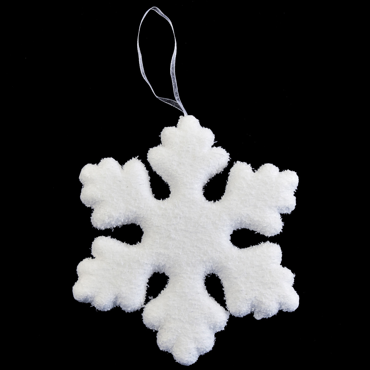 Die weiße Schneeflocke hat mit dem Band eine Gesamtlänge von circa 23 Zentimetern und verfügt über einen Durchmesser von etwa 15 Zentimetern.