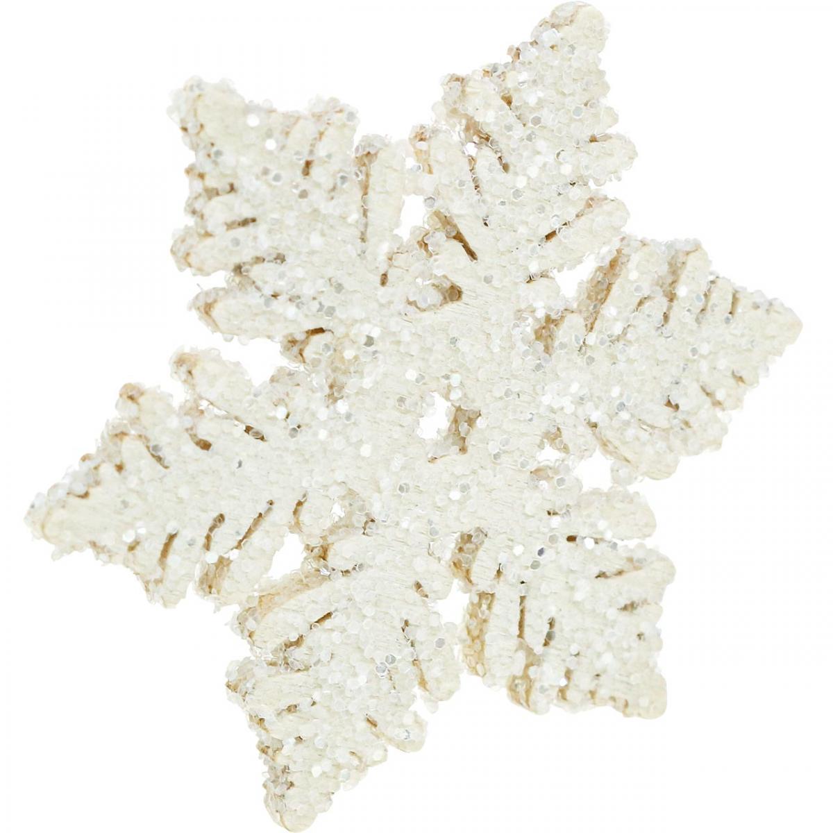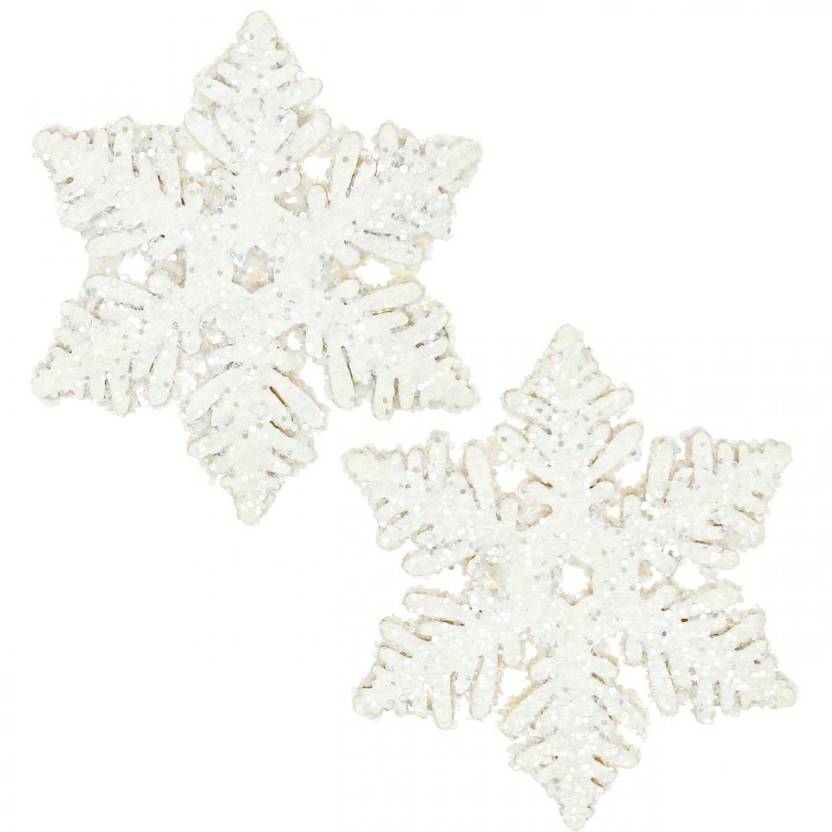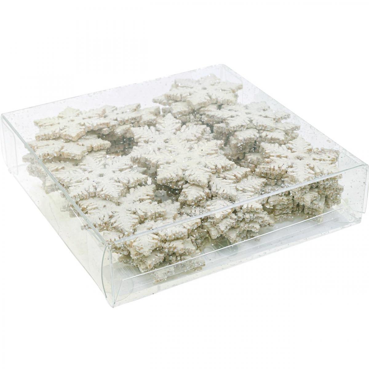 Produktname: Schneeflocken Holz 4cm Weiß mit Glimmer 72 St