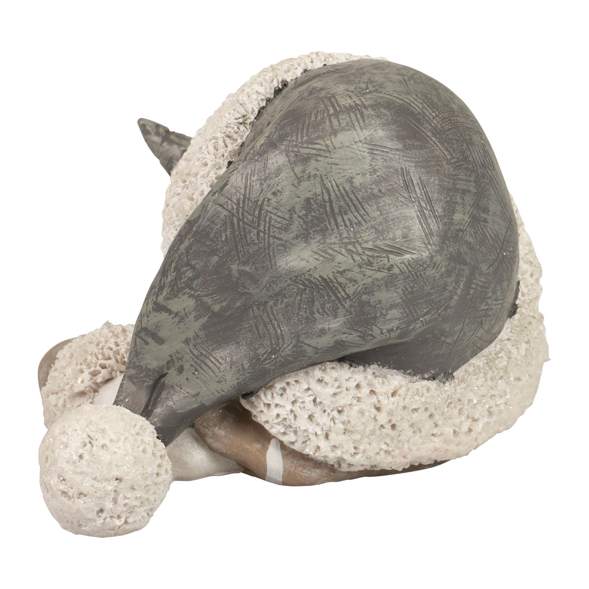 Die Schneemann-Deko besteht aus Polyresin und hat eine breite flache Stellfläche, auf der Sie die Winterdeko sicher abstellen können.