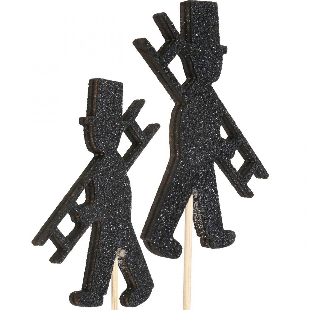 Die Silvesterdeko besteht aus 24 kleinen Kaminkehrern auf einem Holzstäbchen. Die Deko-Figuren haben die Silhouette eines Schornsteinfegers mit Zylinder, der eine Leiter trägt. Die Blumenstecker sind in einem edlen Schwarz mit Glitter gefärbt, welches ein leichtes Funkeln von sich gibt.