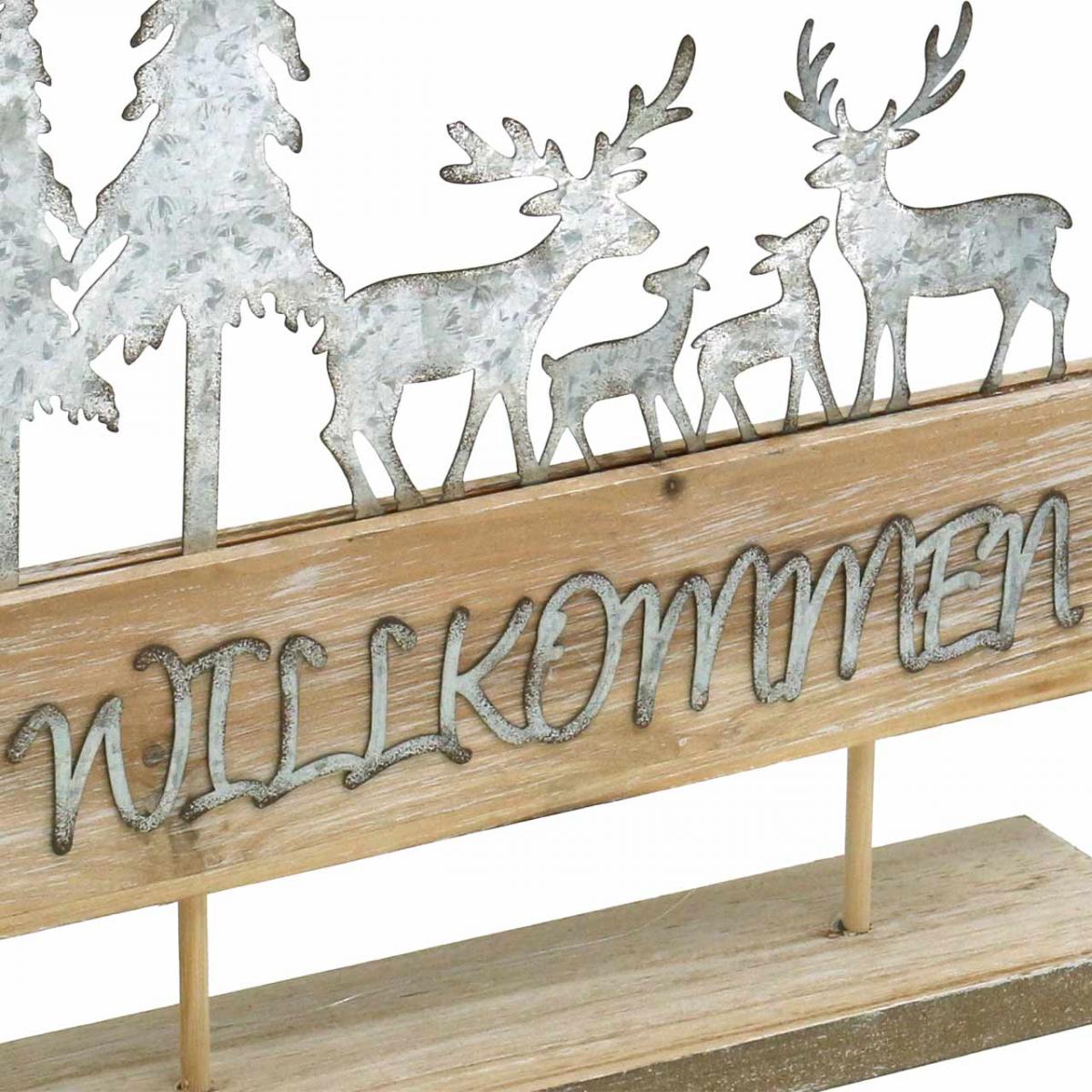 Die Wald-Silhouette aus Metall besteht aus zwei Tannenbäumen, zwei großen Hirschen und zwei kleinen Rehen. Das Diorama mit Waldtieren ist auf einer Holzdeko mit metallener Aufschrift “Willkommen” befestigt. Ein Holzfuß verleiht dem Tannenwald mit Hirschdeko einen sicheren Stand und lässt Sie die Weihnachtsdeko variabel aufstellen.