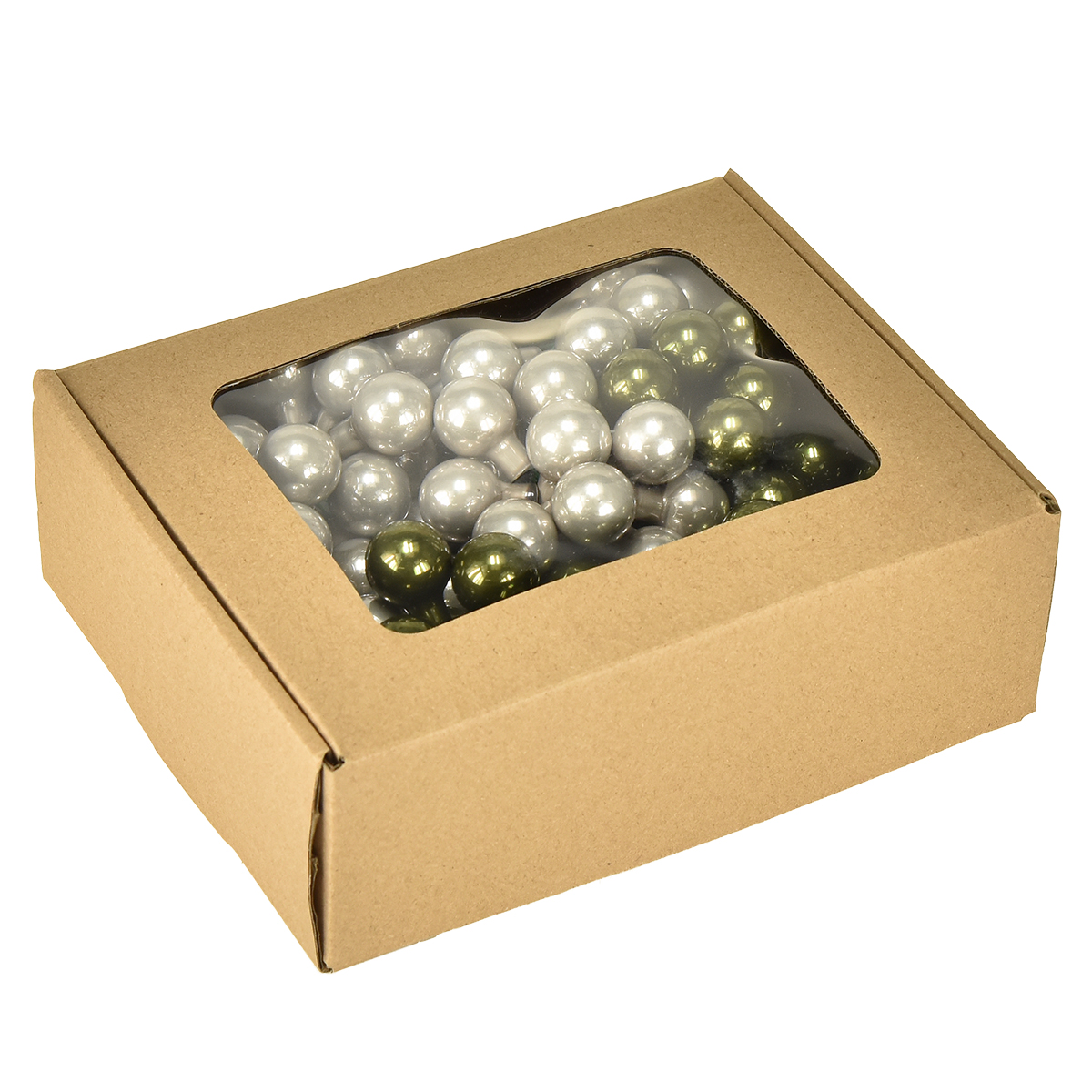 Die grünen und silbergrauen Spiegelbeeren befinden sich zu insgesamt 140 Stück in einer Box und sind zu mehreren Bündeln zusammengefasst, die sich jedoch ganz einfach lösen lassen. Die Deko-Kugeln bestehen aus glänzendem Glas, besitzen jeweils einen Durchmesser von circa 20 Millimetern und sind inklusive Draht in etwa 15 Zentimeter lang.