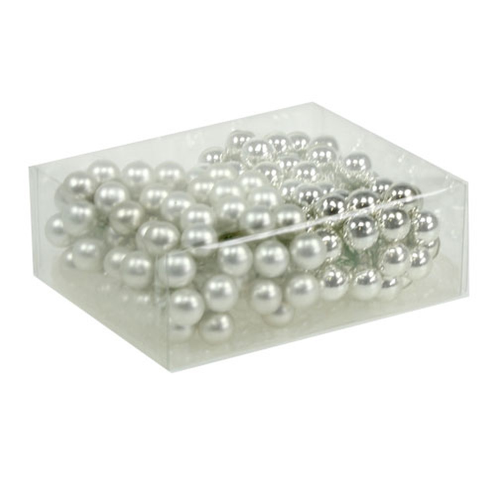Die Spiegelbeeren im Silber-Mix werden in einer Box zu insgesamt 140 Stück angeboten. Mit dem Draht haben Sie eine Gesamtlänge von etwa 15 Zentimetern. Die Glaskugeln haben dabei einen Durchmesser von circa 20 Millimetern.