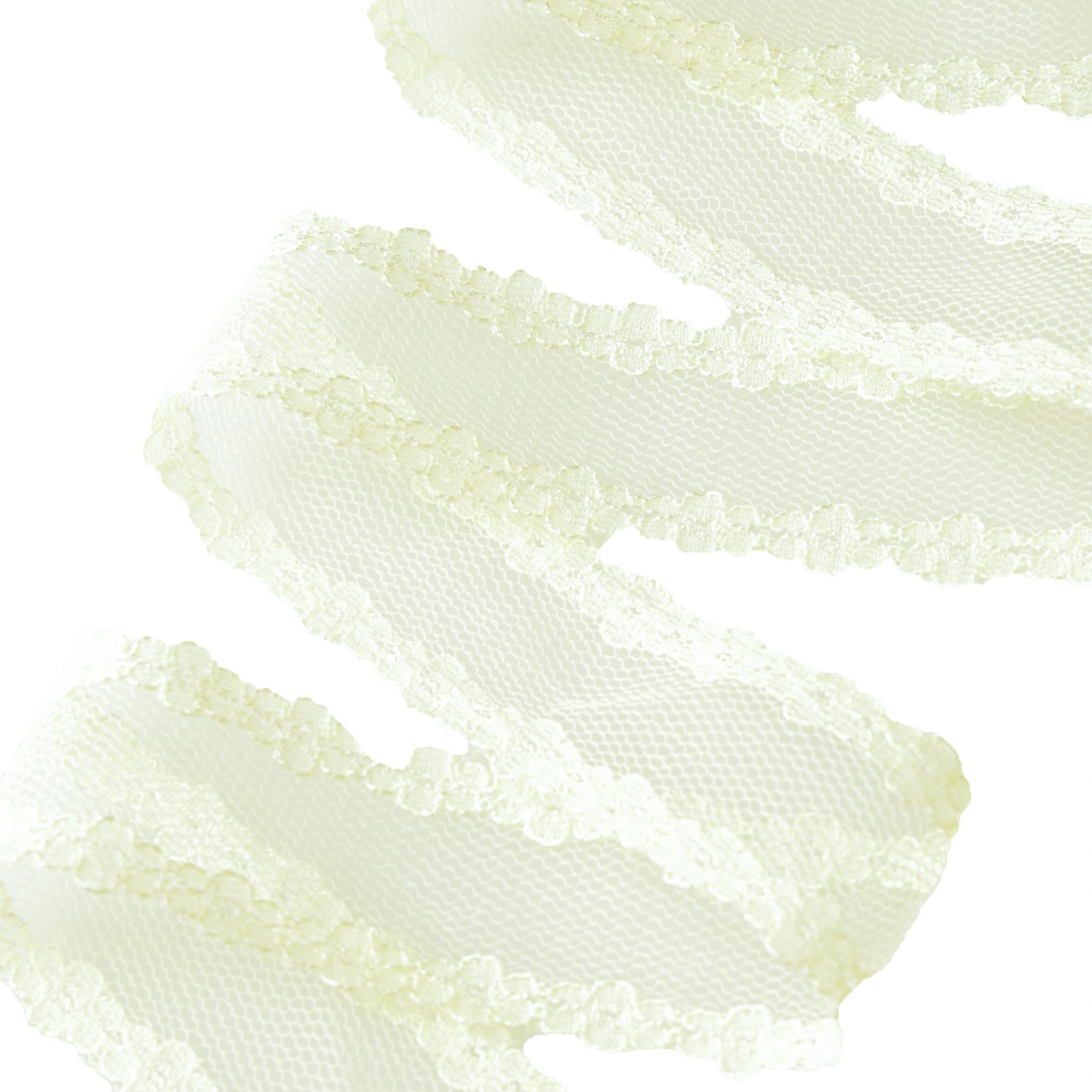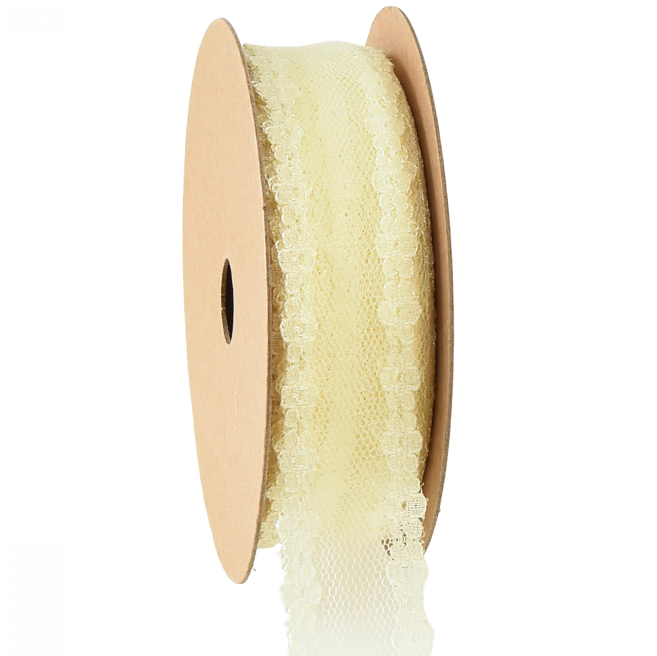 Das filigran wie ein Netzband durchbrochene Spitzenband gefällt durch ein zartes, sehr helles Pastellgelb. Den Blumenmotiven entlang der Ränder verdankt das Band seinen verspielten Charakter.