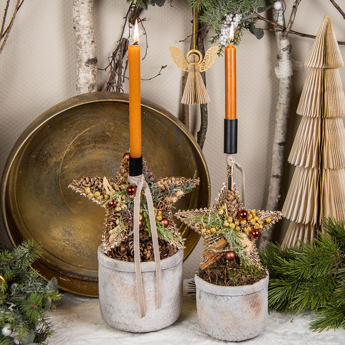 Die orangen Spitzkerzen bekommen Sie in einer Packung mit 12 Stück. So können Sie auch Kränze und Gestecke immer wieder neu bestücken.
