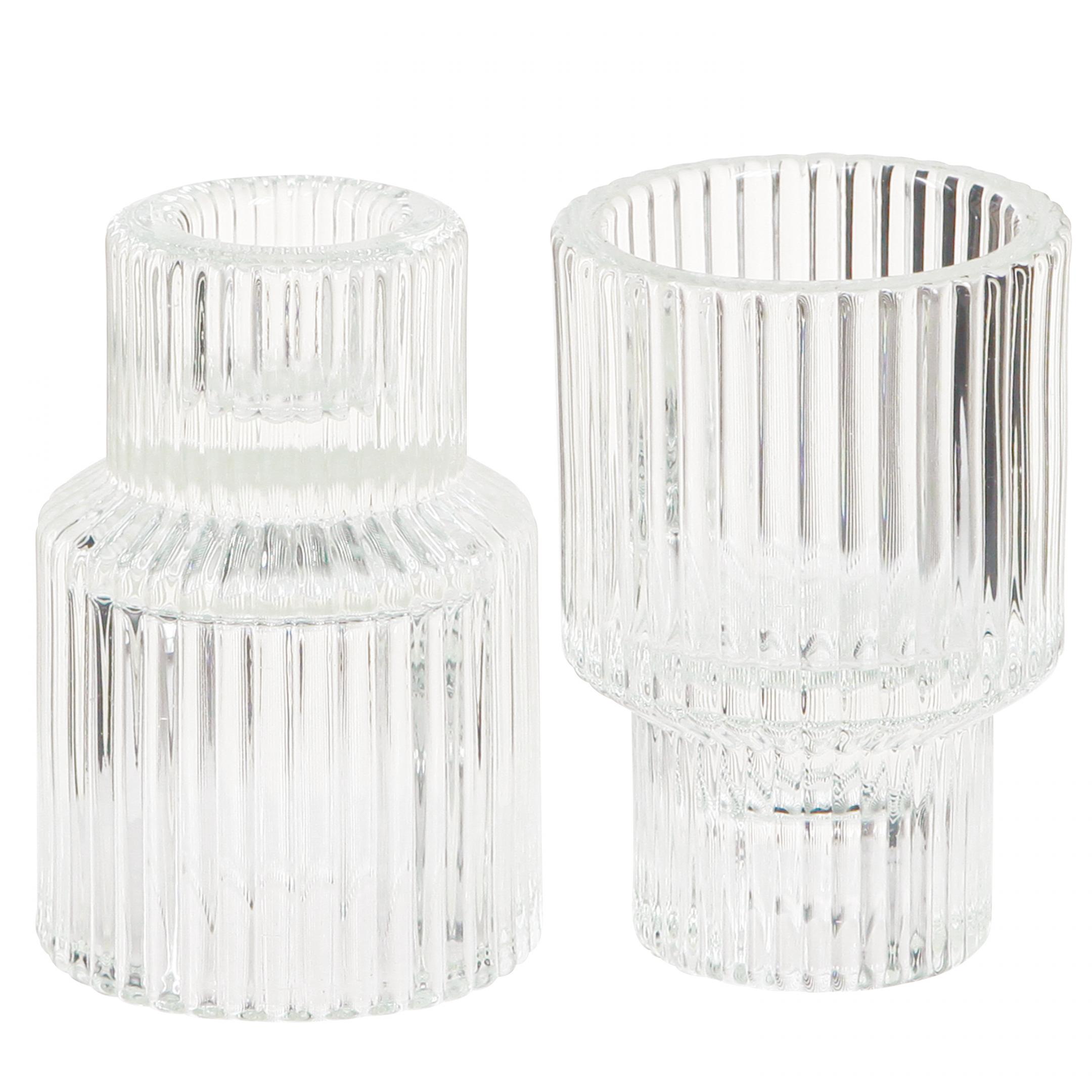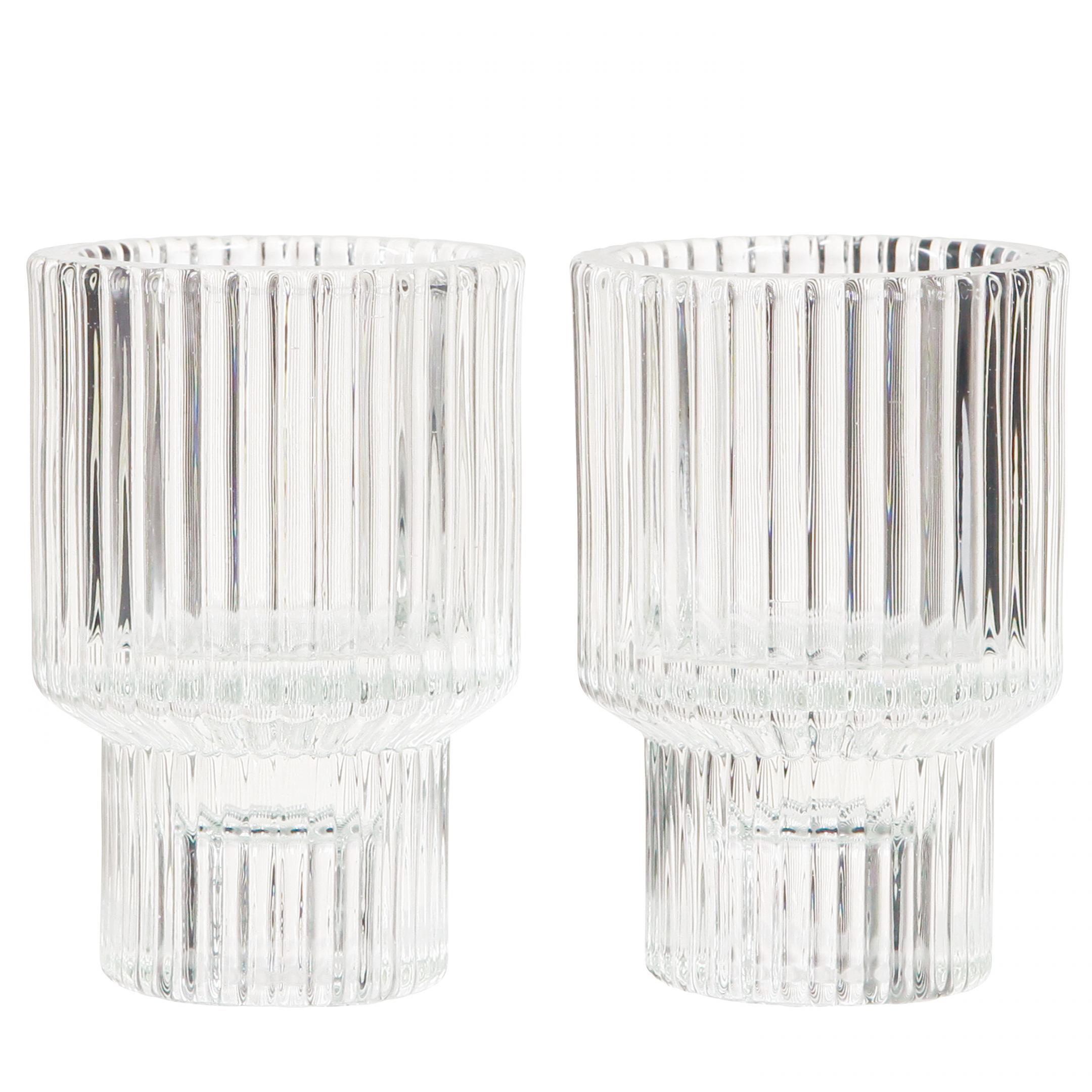 Diese Kerzenhalter aus Glas sind ein wahres Schmuckstück in jeder Wohnung und harmonieren hervorragend mit einem Retro-Dekorationsstil. Die geriffelten Seiten geben den Kerzenhaltern ihren unverkennbaren Retro-Charme, während das transparente Glas zeitlose Eleganz versprüht. Kombinieren Sie die Kerzenständer mit farbigen Kerzen für einen exzentrischen Look oder bleiben Sie klassisch mit weißen oder cremefarbenen Kerzen.