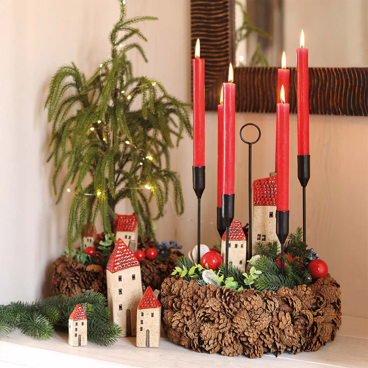 - Erstellen Sie ein festliches Adventsarrangement, indem Sie den Kerzenhalter mit Tannenzweigen und kleinen Dekorationsfiguren aus dem Floristik24-Sortiment kombinieren.
