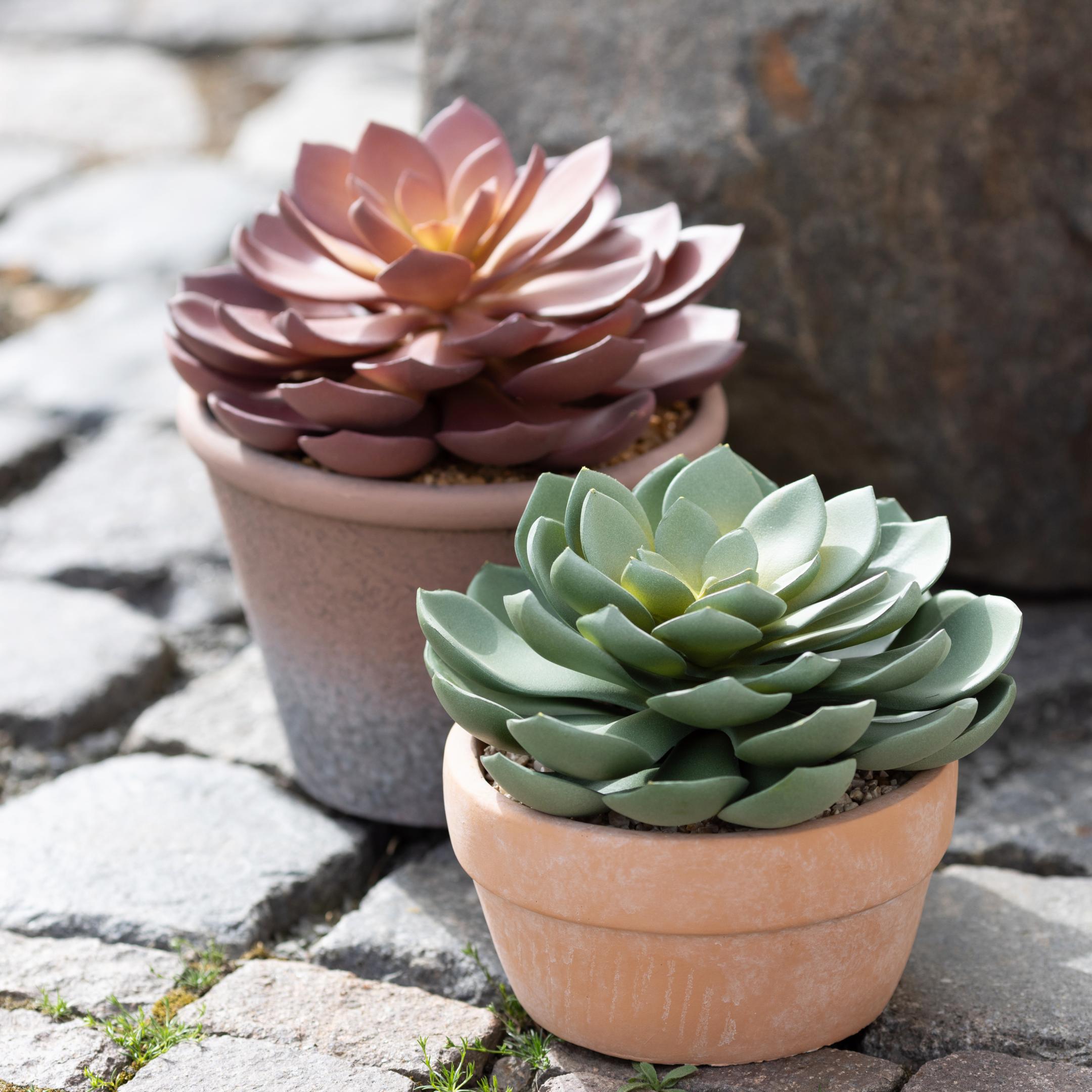 Diese Sukkulente im Topf gibt es als künstliche Pflanze außerdem in Rot und in einer größeren Variante – gestalten Sie Kunstpflanzen-Deko wie gewachsen.