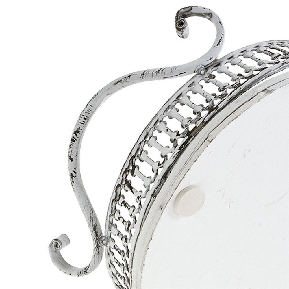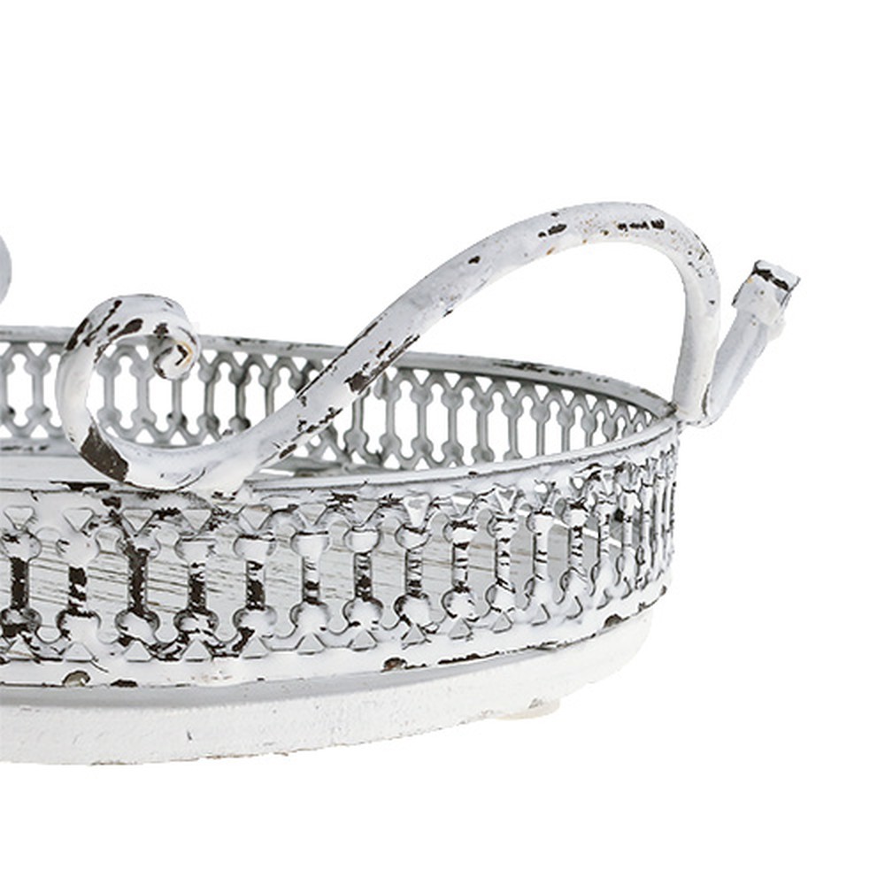Das ovale Tablett besitzt einen Boden aus Holz und einen Rahmen mit Griffen aus Metall. Beide Materialien sind für einen künstlichen Alterungseffekt weiß gewaschen. Das Tablett ist circa 23 Zentimeter lang, etwa 17,5 Zentimeter breit und inklusive der Griffe ungefähr 7,5 Zentimeter hoch, ohne Griffe 4,5 Zentimeter.