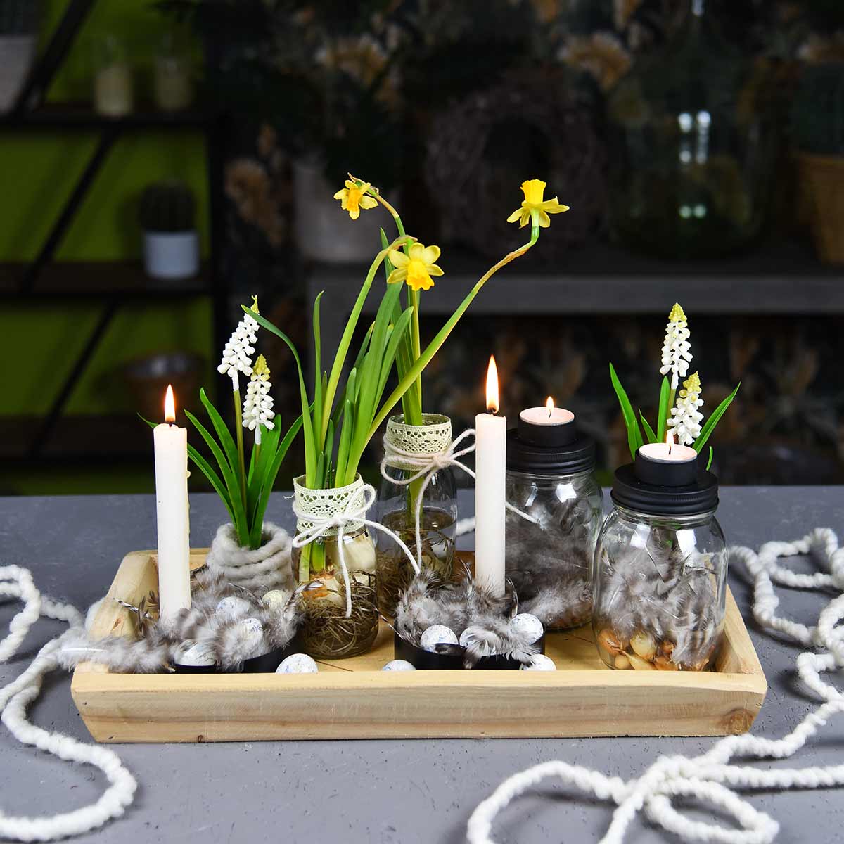 Nutzen Sie die Holzschale als Kerzentablett und fügen Sie je nach Jahreszeit Töpfchen mit Frühblühern, Herbstfrüchten, Christbaumkugeln und Tannengrün hinzu.