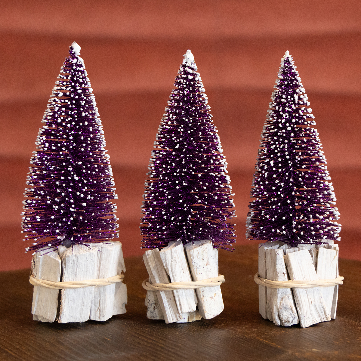 Deko-Tannenbaum in Lila mit Schneespitze auf rustikalem Holzfuß 15cm 3St.