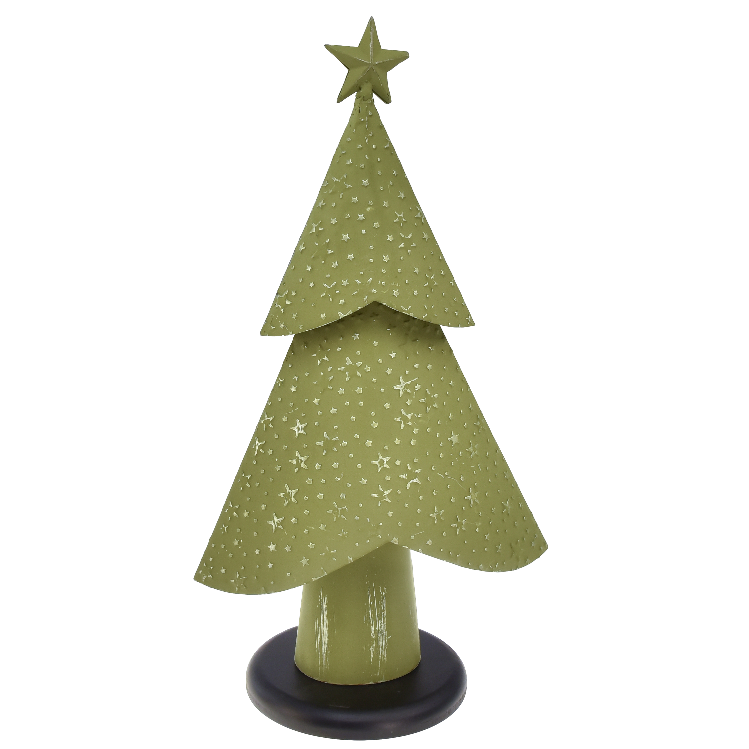 Hochwertige Materialien und die sorgfältige Verarbeitung zeichnen diesen Metall-Tannenbaum aus, der grün gewaschen und geprägt mit Sternen überzeugt. Mit seiner Höhe von etwa 46,5 Zentimetern ist er sowohl als Dekoration im Eingangsbereich als auch als festliche Tischdeko für Weihnachten einsetzbar. Die nostalgisch anmutenden künstlichen Abriebspuren verleihen der stilisierten Metall-Tanne ein authentisches Vintage-Flair, während der runde Sockel aus Holz in Schwarz eine stabile und hochwertige Basis bildet.