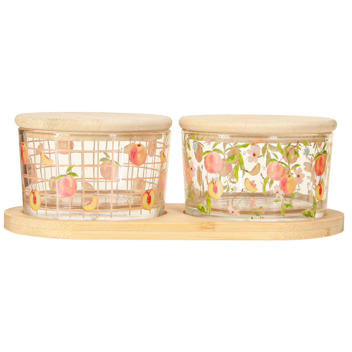 Sommerliches Tapas-Set: Gläser mit Pfirsich-Motiv und Holzdeckel