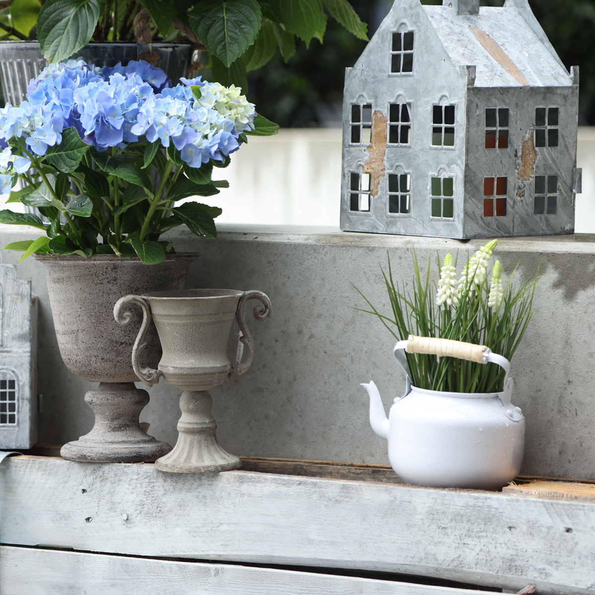 So dekoriert, passt die weiße Teekanne sehr gut zum angesagten Landhausstil und kann für ein rundes Gesamtbild mit weiteren weiß lackierten Blechartikeln, zum Beispiel unseren Tassen mit Untertellern, kombiniert werden.