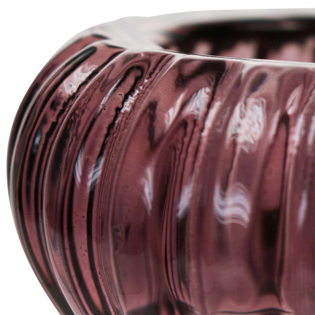 Das dicke, getönte Glas mit dem markanten Lamellenmuster lässt den Kerzenhalterleicht zwischen Lila und klarem Glas changieren. So entsteht ein faszinierender Schimmer, wann immer Sie den runden Kerzenhalter drehen.
