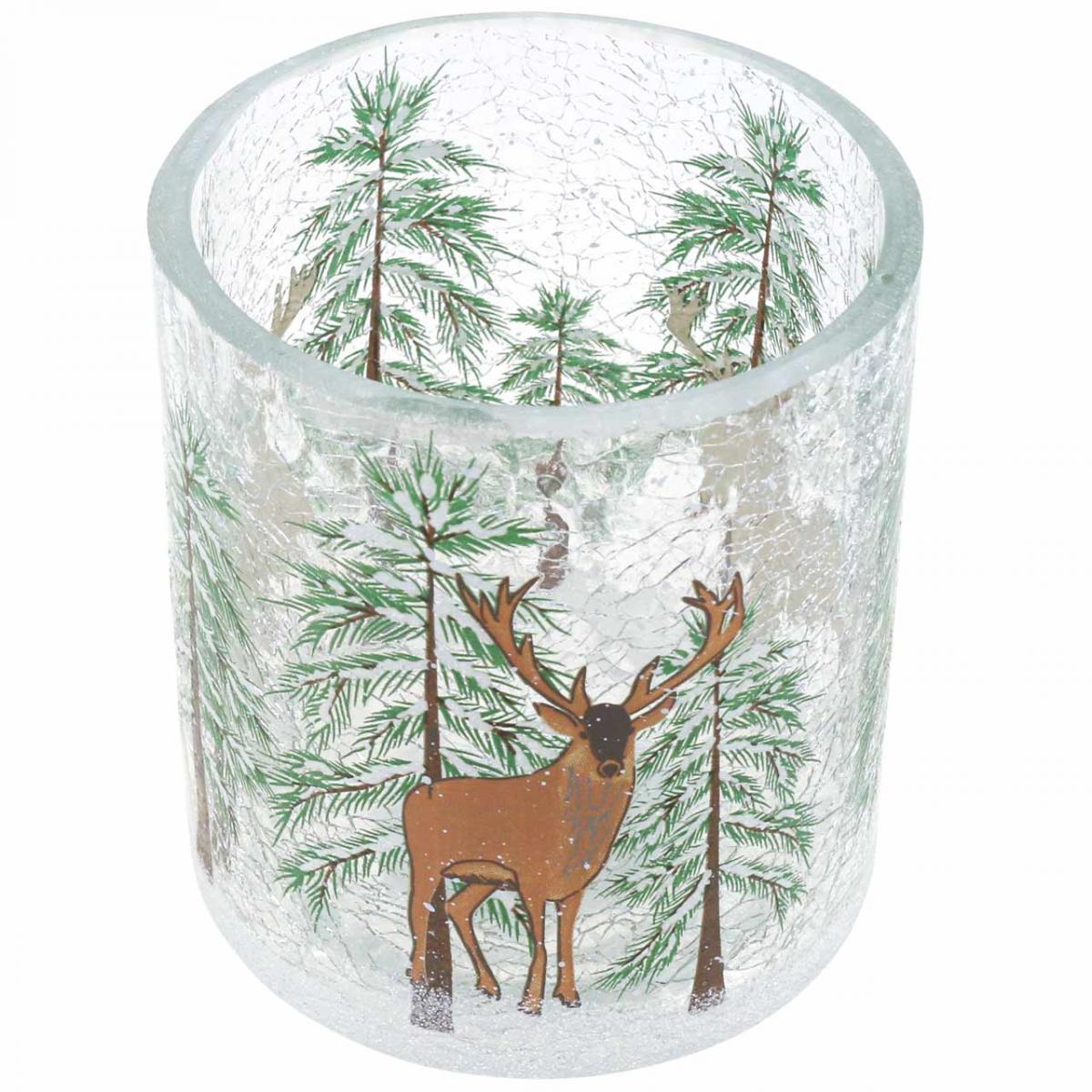 "Crackle" bezeichnet den Effekt, dass das Glas wie gesprungen aussieht. Dennoch ist das Kerzenglas ganz neu und mit einem stimmungsvollen Winterwald verziert. Drei Hirsche spazieren auf dem Teelichthalter durch den Schnee, der als eisiger Glitter außen auf dem Glas angebracht ist.
