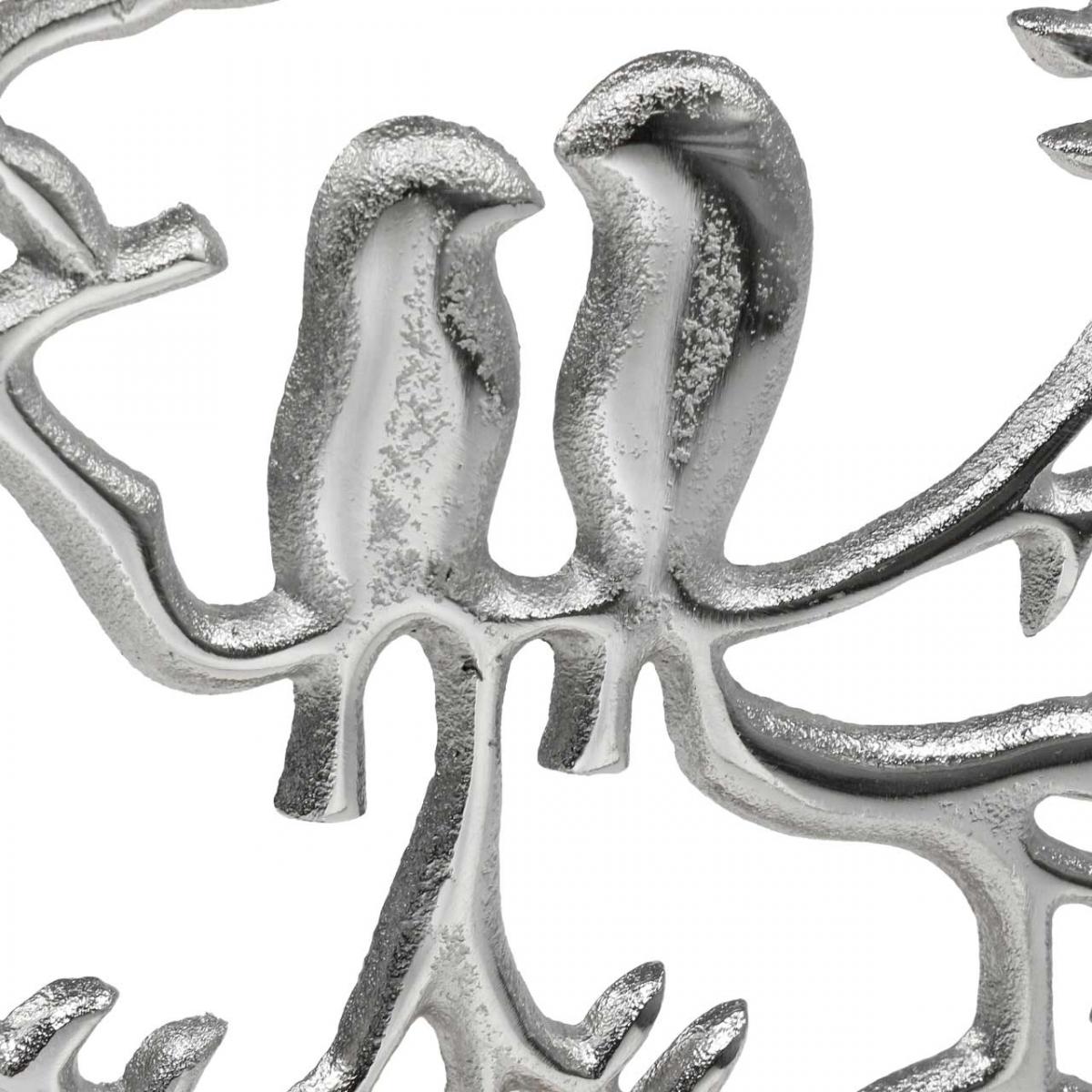 Nutzen Sie die schöne silberne Metall-Deko als Dekoartikel für Ihr Wohnzimmer auf einem Regal, einer Anrichte, dem Fensterbrett oder im Frühling auch als Tischdeko. Der Vogel auf dem Ast im Ring besitzt einen stabilen Standfuß aus natürlichem Mangoholz mit Schaumstoff-Schonern an der Unterseite.