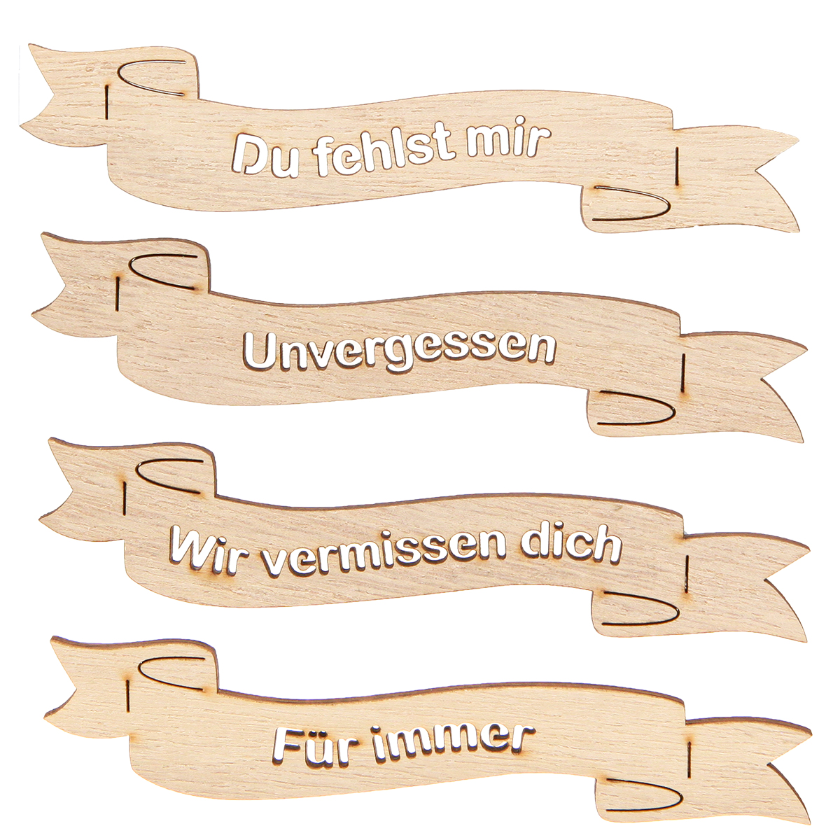 - Menge: 12 Stück, 4-fach sortiert (mit den Sprüchen "Du fehlst mir", "Unvergessen", "Wir vermissen dich", "Für immer")