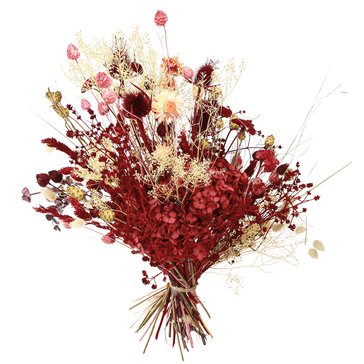 - Hochwertiger Trockenblumenstrauß in Rot und gebleichten Nuancen