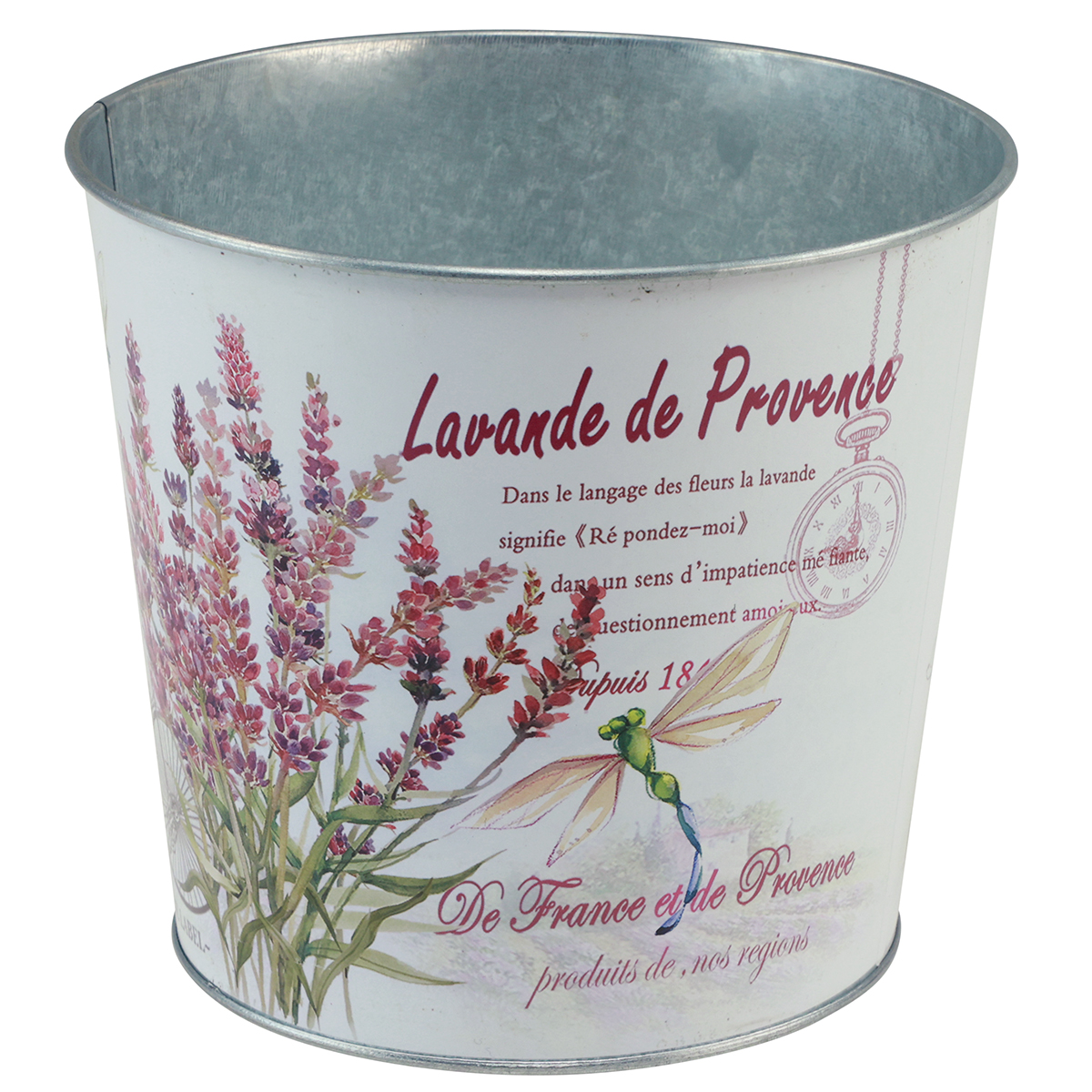 Der Zinktopf ist innen silbern und außen mit einer bedruckten Folie beklebt. Libellen umfliegen auf weißem Grund üppig blühenden Lavendel und nostalgische Motive wie eine Uhr und ein Hochrad beschwören die gute alte Zeit.