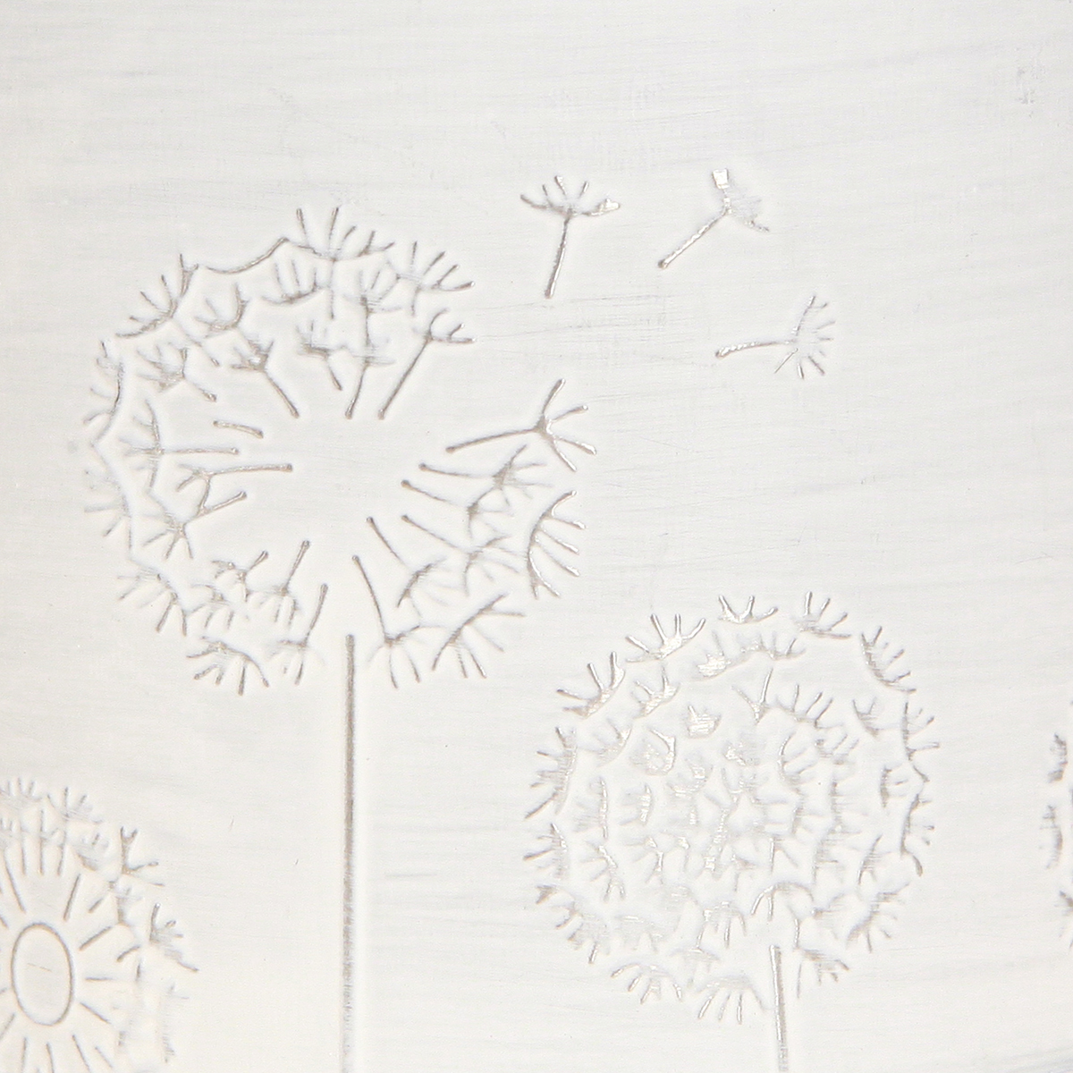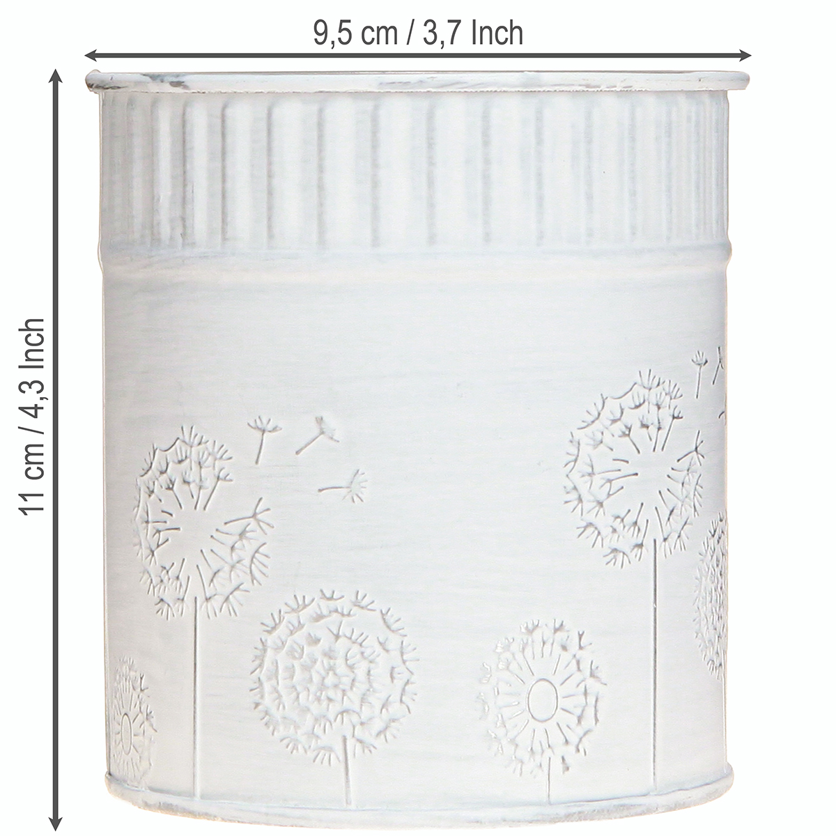 Der kleine Blumentopf ist nostalgisch geweißt, auf der Innenseite silbern verzinkt und mit einem geprägten Motiv verschiedener Pusteblumen hübsch verziert.