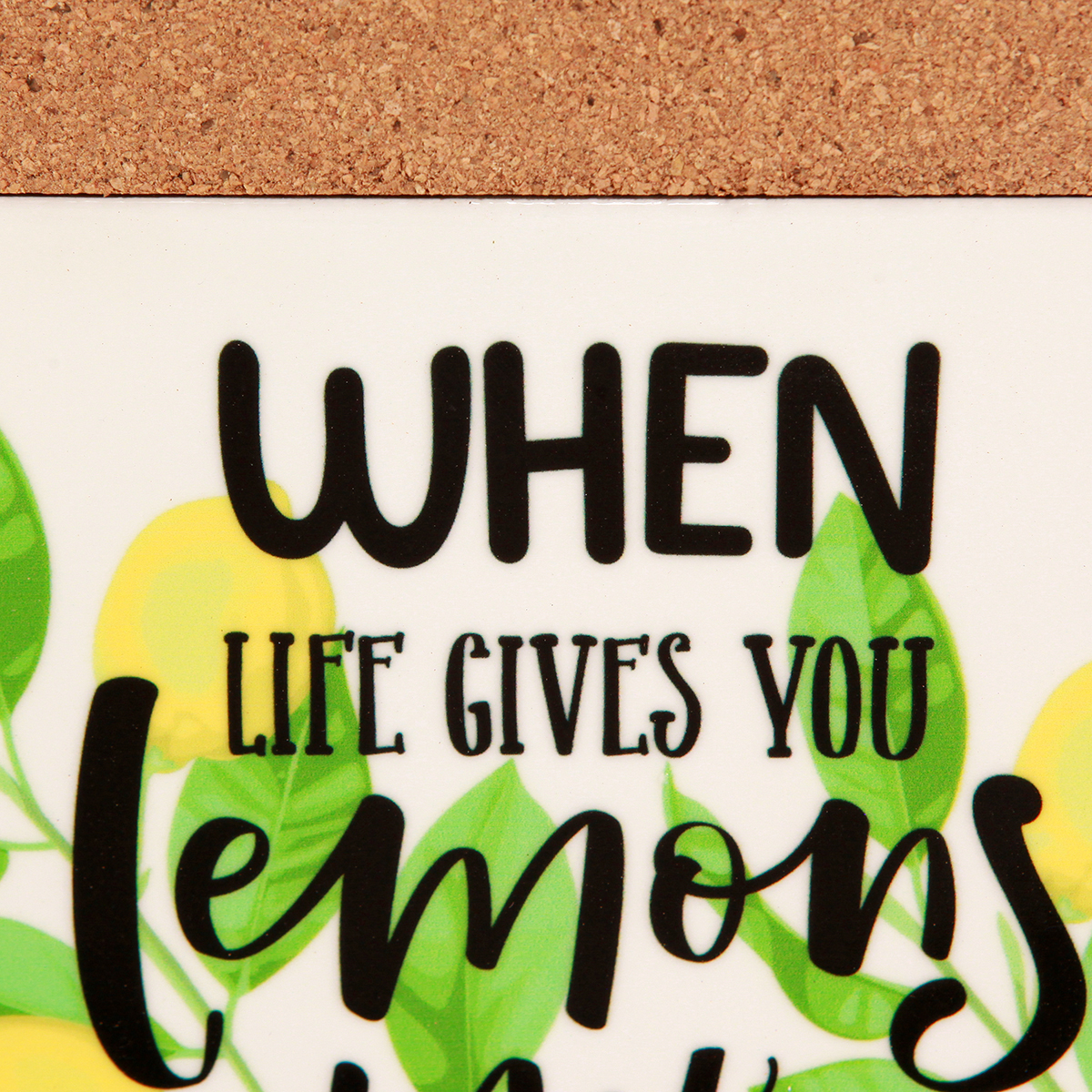 Bringen Sie die Frische des Sommers direkt auf Ihren Tisch mit unserem farbenfrohen Untersetzer mit Zitronen. Diese bunt gestalteten Platzsets aus Kork und Keramik sind ein wahrer Blickfang und zaubern mit ihren fröhlichen Zitronenmotiven sofort eine erfrischende Atmosphäre in Ihr Zuhause. Ob Sie ein Sommerfest im Garten veranstalten oder einfach nur Ihren Alltag bunter gestalten möchten, dieses Set ist die ideale Wahl. Die Kombination aus leuchtenden Farben und Motiven wie Zitronenzweigen, Blüten und lustigen Sprüchen macht diese Platzsets zu einem unverzichtbaren Dekoelement für eine sommerliche Tischdekoration. Gefertigt aus hochwertiger Keramik mit einem schützenden Korkrand, sind sie nicht nur stilvoll, sondern auch praktisch, um Ihre Möbel vor unschönen Kratzern und Flecken zu bewahren.