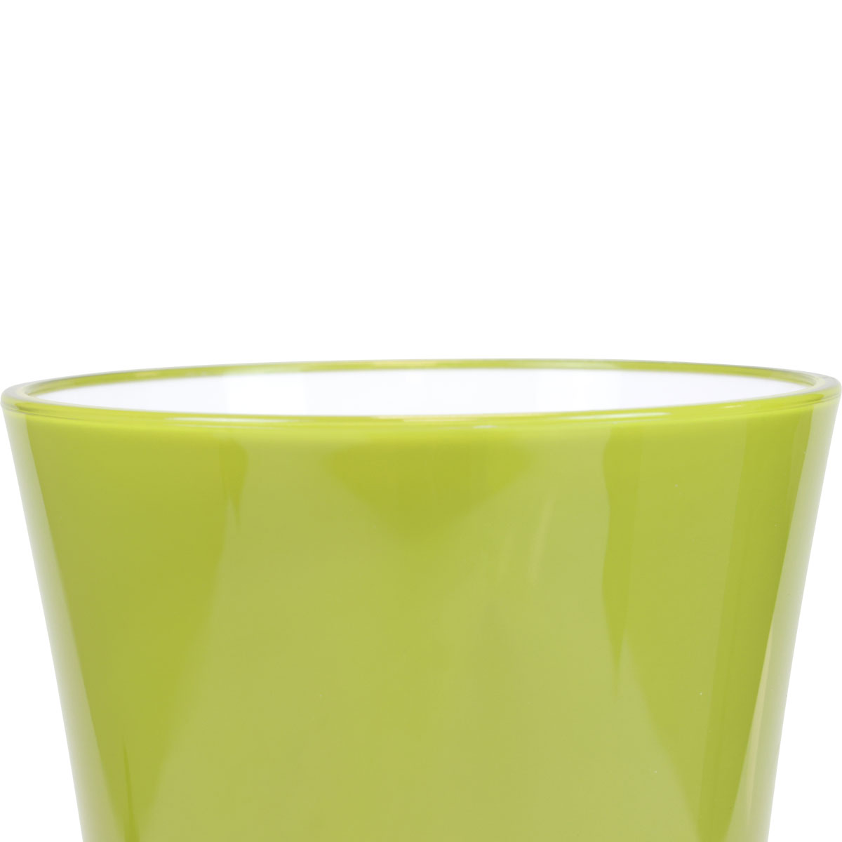 Die Innenschicht ist weiß und reicht bis kurz vor den Boden, während die grüne, leicht transparente Außenschicht die Vase komplett umgibt.