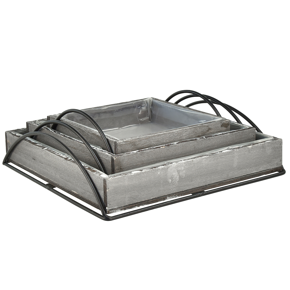 Entdecken Sie unser graue-weiß gewaschenes Set aus 3 Holztabletts, die auf eleganten Metallgestellen ruhen. Jedes Holztablett mit Griffen aus Metall bietet nicht nur praktische Aufbewahrung, sondern verleiht auch jeder Tischdekoration einen Hauch von Klasse. Für Eventplaner, Dekorateure und Floristen ist dieses Holztablett Set diverse Größen eine ideale Ergänzung für ihr Repertoire an Dekoelementen.