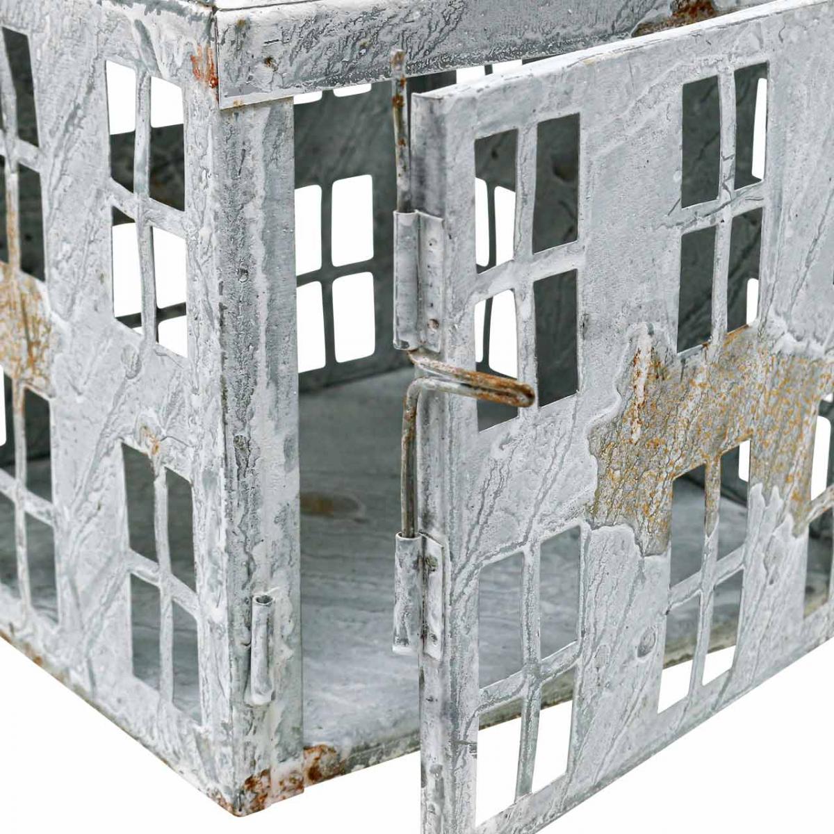Das Metall der Laterne wurde weiß gewaschen und hat eine kunstvolle Oberfläche im Vintage-Look erhalten. Im Dach gibt es eine Laternenöffnung für Kerzenlicht. Ein Metallbügel ist angebracht, um die ganze Konstruktion aufzuhängen.