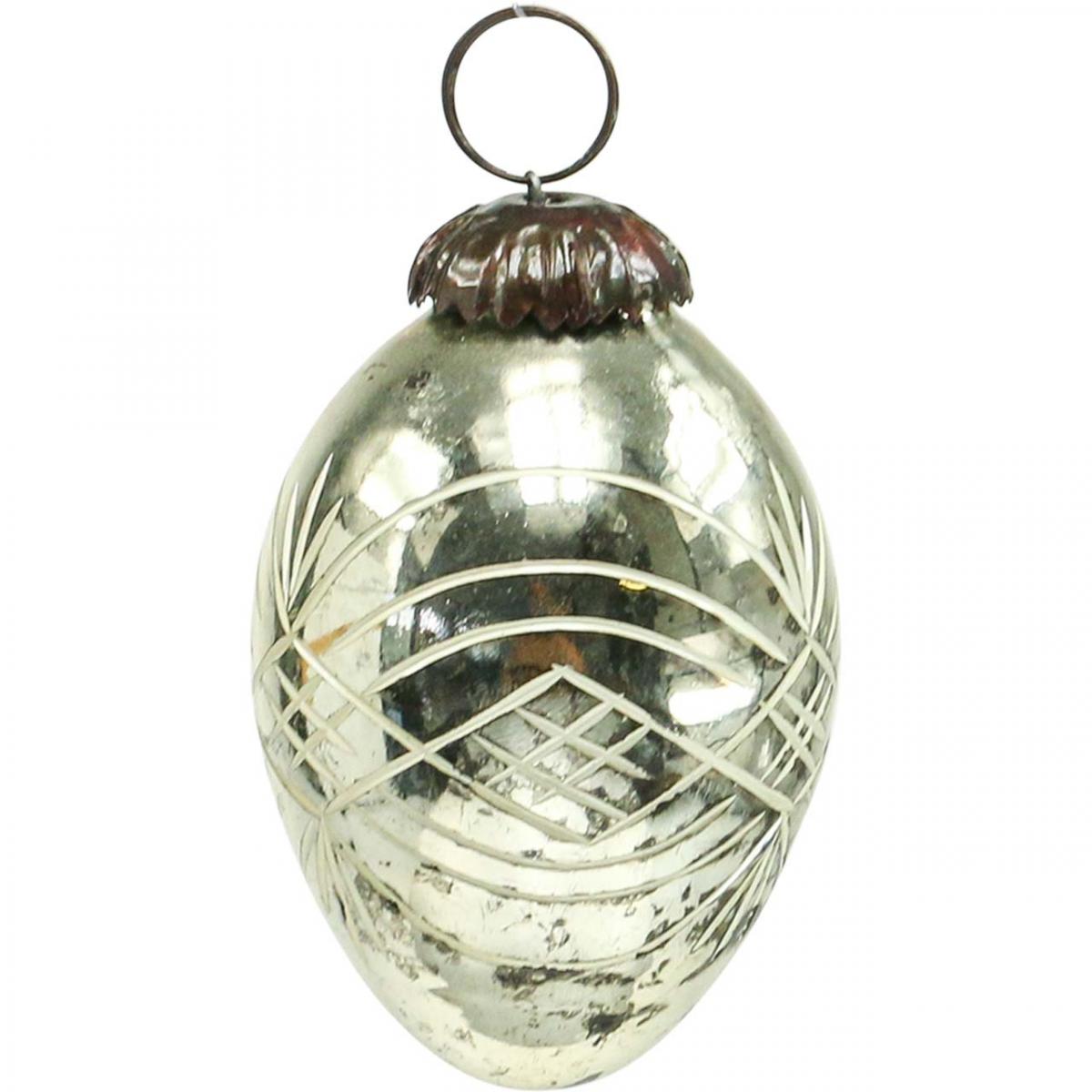 Außen ist die spiegelnde Oberfläche der Weihnachtskugeln jeweils mit einem traditionellen Muster aus in sich verlaufenden Schwüngen verziert, die in das Glas eingraviert worden sind. Eine kupferfarbene Hülse mit Aufhängung an der Oberseite bildet den Abschluss der Weihnachtskugeln aus Glas.
