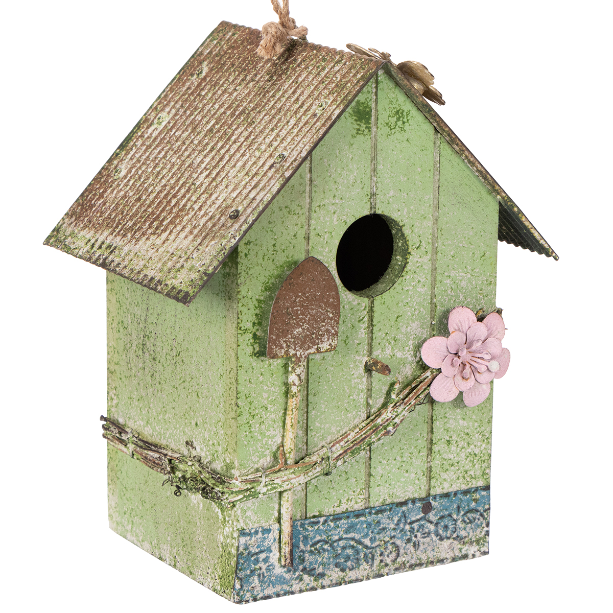 Dieses handgefertigte Vogelhaus aus Holz beeindruckt mit seiner einzigartigen Optik im romantischen Landhausstil. Die zarte grüne Farbe mit aufregenden Shabby Chic-Details sowie die geschmackvolle Blumenverzierung machen es zum Blickfang in jedem Garten. Mit den Maßen 16 cm Länge, 16 cm Breite und 19 cm Höhe passt es perfekt auf Fensterbänke, Terrasse oder als Akzent in Ihrem Garten. Der Vintage-Touch, der durch die feinen Abschürfungen und die rustikale Verarbeitung entsteht, verleiht dem Vogelhaus eine besonders nostalgische Note.