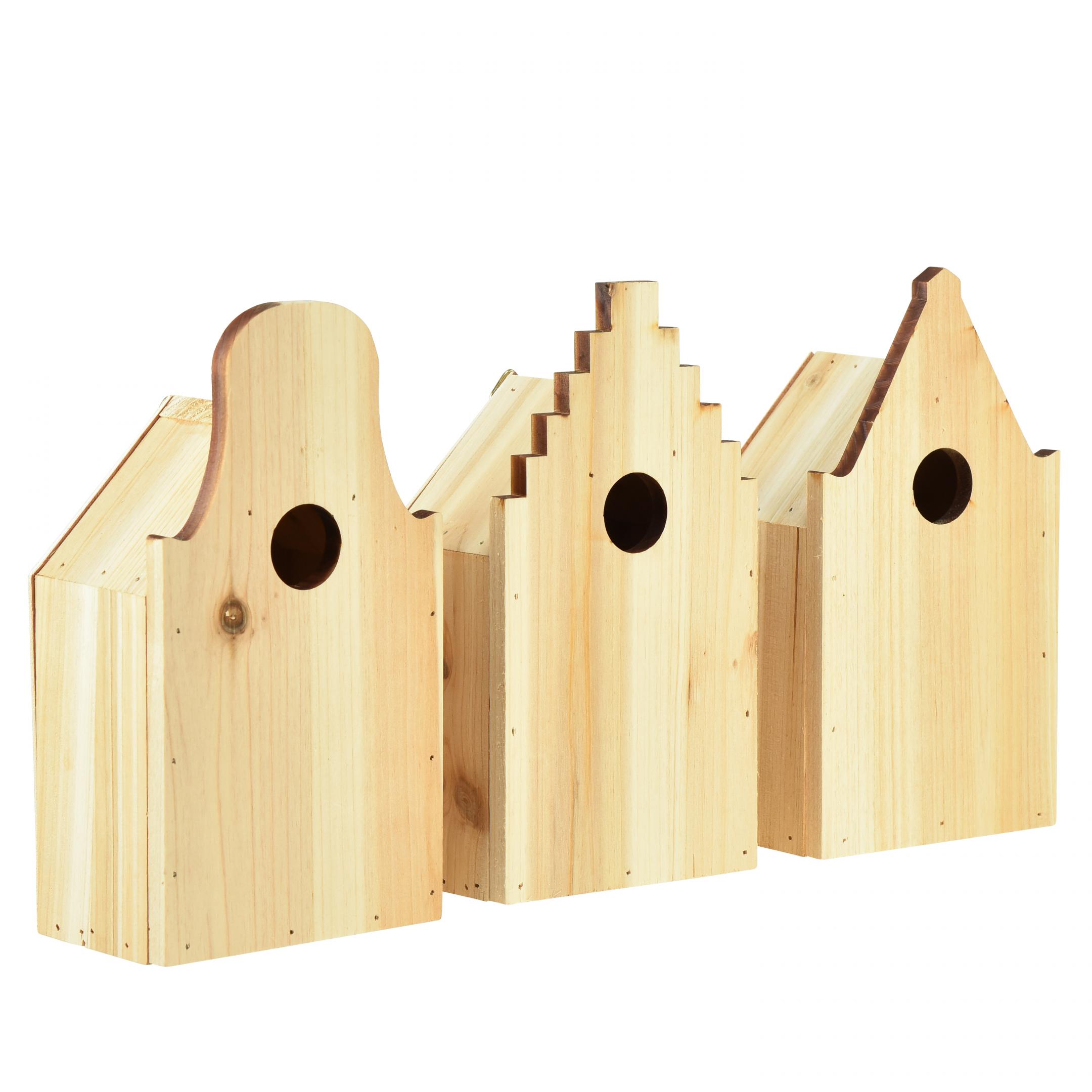 Sie erhalten das Vogelhaus aus Holz zu 3 Stück. Die Grundmaße sind dieselben. Unterscheiden lassen sich die Brutkästen durch ihre ansprechenden verschiedenen Fassaden.