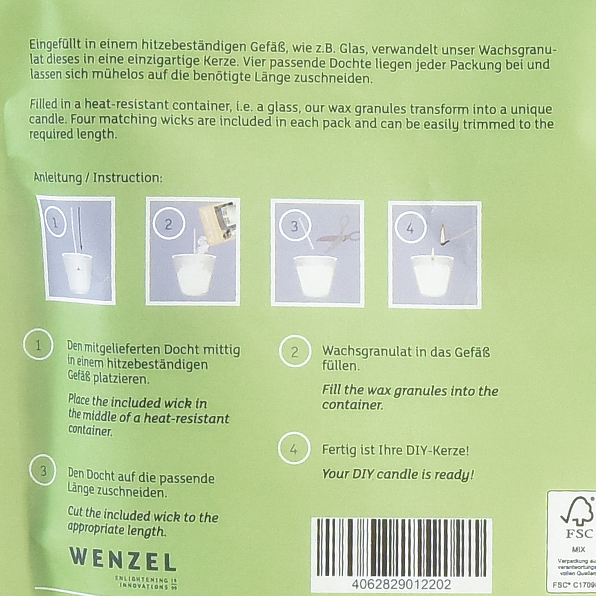 Beschenken Sie sich selbst oder Ihre Lieben mit einem einzigartigen, handgemachten Geschenk. Unser Wachsgranulat kommt mit einem praktischen Docht und Dochthalter, sodass Sie sofort anfangen können, Ihre Duftkerzen im Glas zu gestalten. Entdecken Sie, wie angenehm Kerzen-Deko zum Selbermachen sein kann, und lassen Sie Ihrer Kreativität freien Lauf.