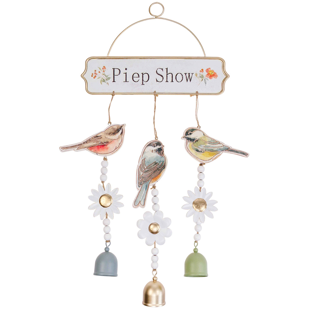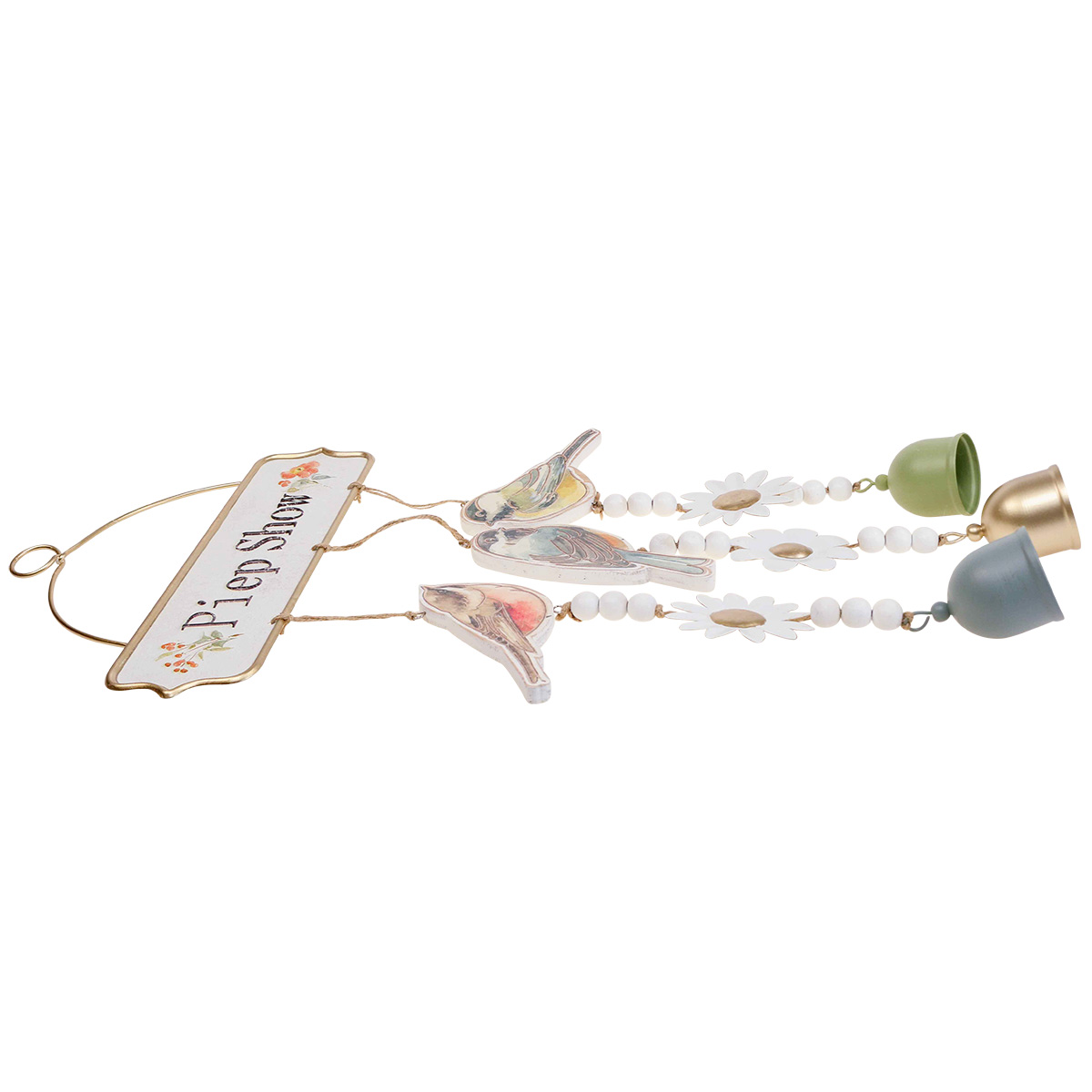 Insgesamt drei verschiedene Dekovögel sind unter der Metall-Schriftzug-Deko mit goldenem Rand an Jutekordeln befestigt. Metallblüten und naturbelassene Holzperlen sowie große Metallglocken in Grün, Blau und Gold vervollständigen die frühlingshaft-sommerliche Optik der Wanddeko aus Metall und Holz. Die Hängedeko für den Frühling ist einseitig farbig bedruckt.