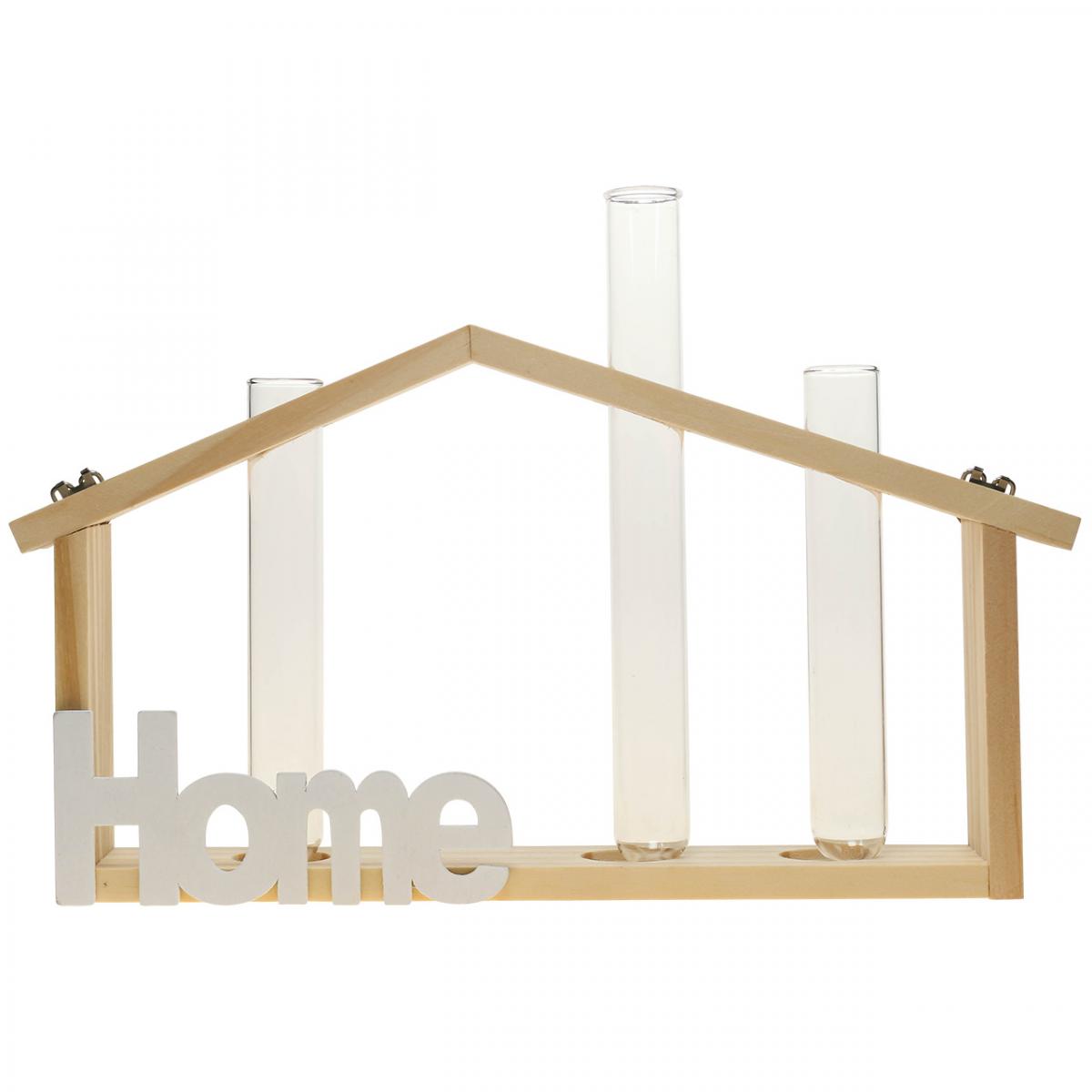 Drei runde Aussparungen auf dem Dach sind bei dieser Holz-Deko für Reagenzgläser aus echtem Glas vorgesehen. Denn die Wanddeko zeigt nicht nur den Schriftzug „Home“, sondern dient als originelle Vase für Blumen.