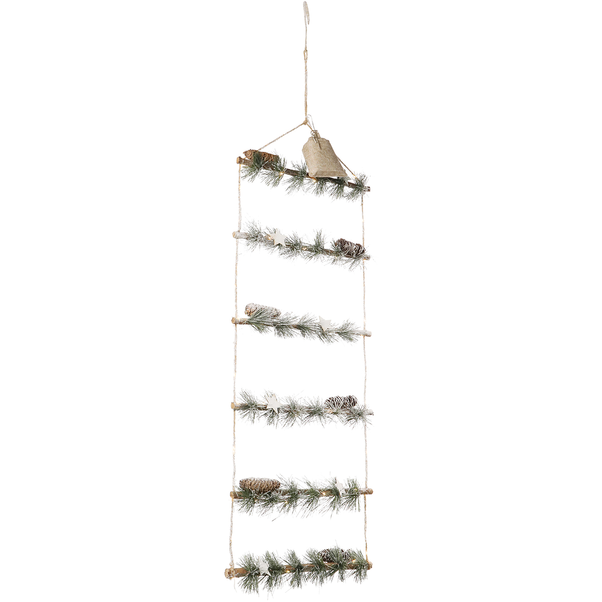 Unsere Wanddeko für Weihnachten und Advent zeichnet sich durch ihre hochwertige Verarbeitung und die Liebe zum Detail aus. Bestehend aus 6 Ästen, die mit Jute zusammengebunden sind, und geschmückt mit künstlichem Tannengrün, echten Zapfen und Holzsternen, ist diese Micro-LED-Lichterkette zu Weihnachten ein echter Hingucker. Sie ist winterlich beschneit und mit 60 warmweißen Micro-LEDs versehen, die für eine stimmungsvolle Beleuchtung sorgen. Das Batteriefach ist geschickt im Jutesäckchen versteckt und somit unsichtbar. Dank des integrierten Timers kann sich die Lichterkette jeden Tag zur gewünschten Zeit automatisch ein- und ausschalten.