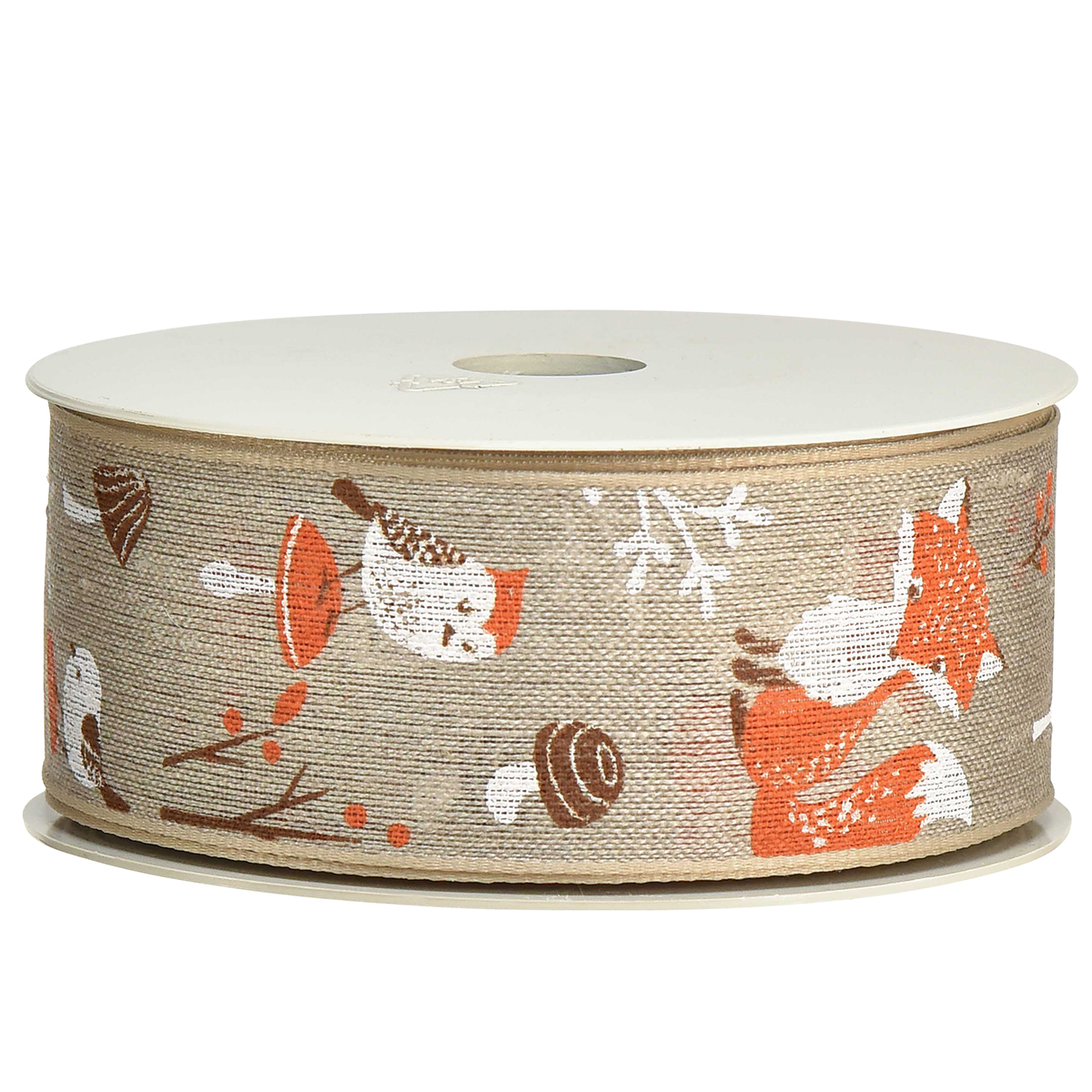 Produktname: Geschenkband Herbst mit Fuchs und Pilzen Leinen Grau 40mm 15m
