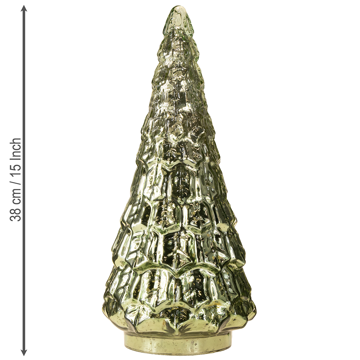 Der grüne Weihnachtsbaum mit LED begeistert nicht nur durch sein kompaktes Design, sondern auch durch die raffinierte Kombination aus plastischer Tannen-Form, Material und Lichtspiel. Der Baum besteht aus Glas und erhält durch die Vintage-Farbabtragungen goldene Lichtakzente, die in Kombination mit dem silbrig-grünen Schimmer der Grundfarbe eine atemberaubende Optik erzeugen. Obendrein steht er auf einem stabilen Kunststoffsockel mit Batteriefach, sodass er flexibel überall platziert werden kann. Das batteriebetriebene LED-Licht sorgt für einen gleichmäßigen, warmen Schein, der selbst in die dunkelsten Wintertage ein stimmungsvolles Licht bringt und Behaglichkeit ausstrahlt. Perfekt, um in verschiedenen Einrichtungsstilen wie Shabby Chic, Landhausstil oder klassischem Vintage-Look eingesetzt zu werden!