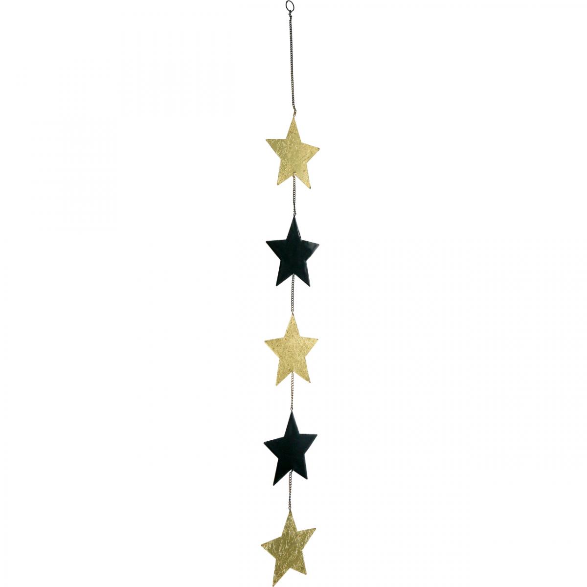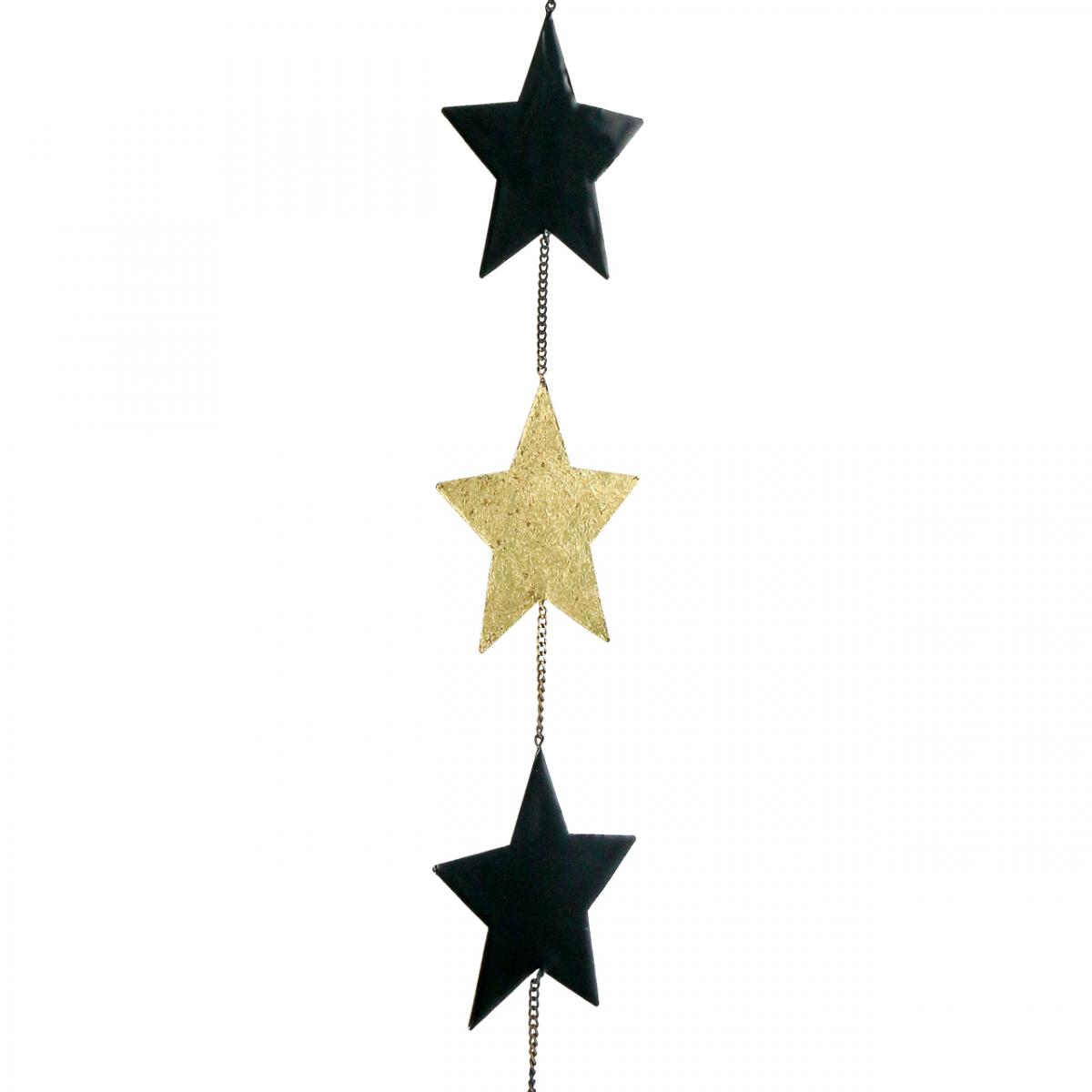 Die metallene Weihnachtsdeko zum Hängen besteht aus insgesamt fünf mittelgroßen Deko-Sternen in Gold und Schwarz, die farbig abwechselnd jeweils mit einem feingliedrigen Kettchen verbunden sind. An der Oberseite der weihnachtlichen Metalldeko befindet sich ein kleiner Metallring, woran Sie den Dekohänger mit Sternen an einem Nagel oder Haken anhängen können.