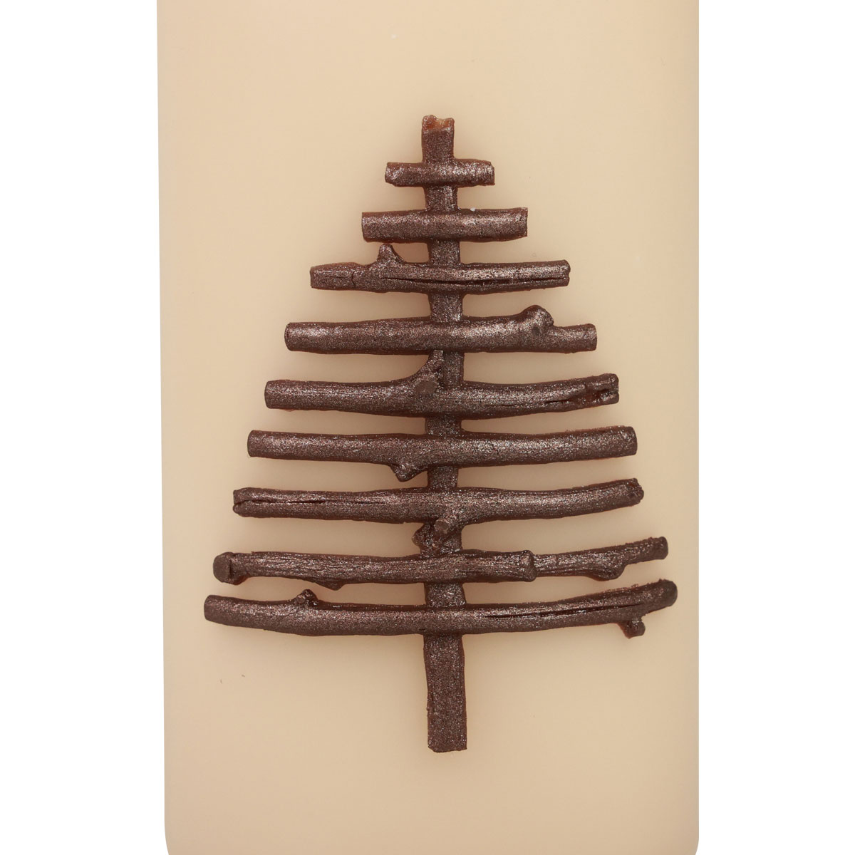 Auf dem hellen Beige der Stumpenkerze kommt der dunkelbraune, stilisierte Weihnachtsbaum großartig heraus. Die Weihnachtskerze überrascht durch ihre lange Brenndauer von ungefähr 63 Stunden. Dass es sich um eine Kerze von Format handelt, erkennen Sie ebenso am RAL-Gütesiegel und der rußarmen, gleichmäßigen Flamme.