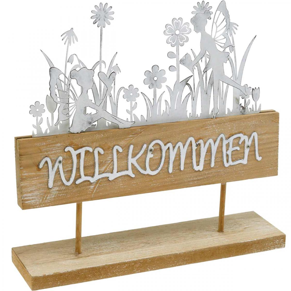 Produktname: Willkommenschild, Aufsteller mit Elfen, Frühlingsdeko aus Metall, Holz Natur, Weiß L28,5cm H27,5cm