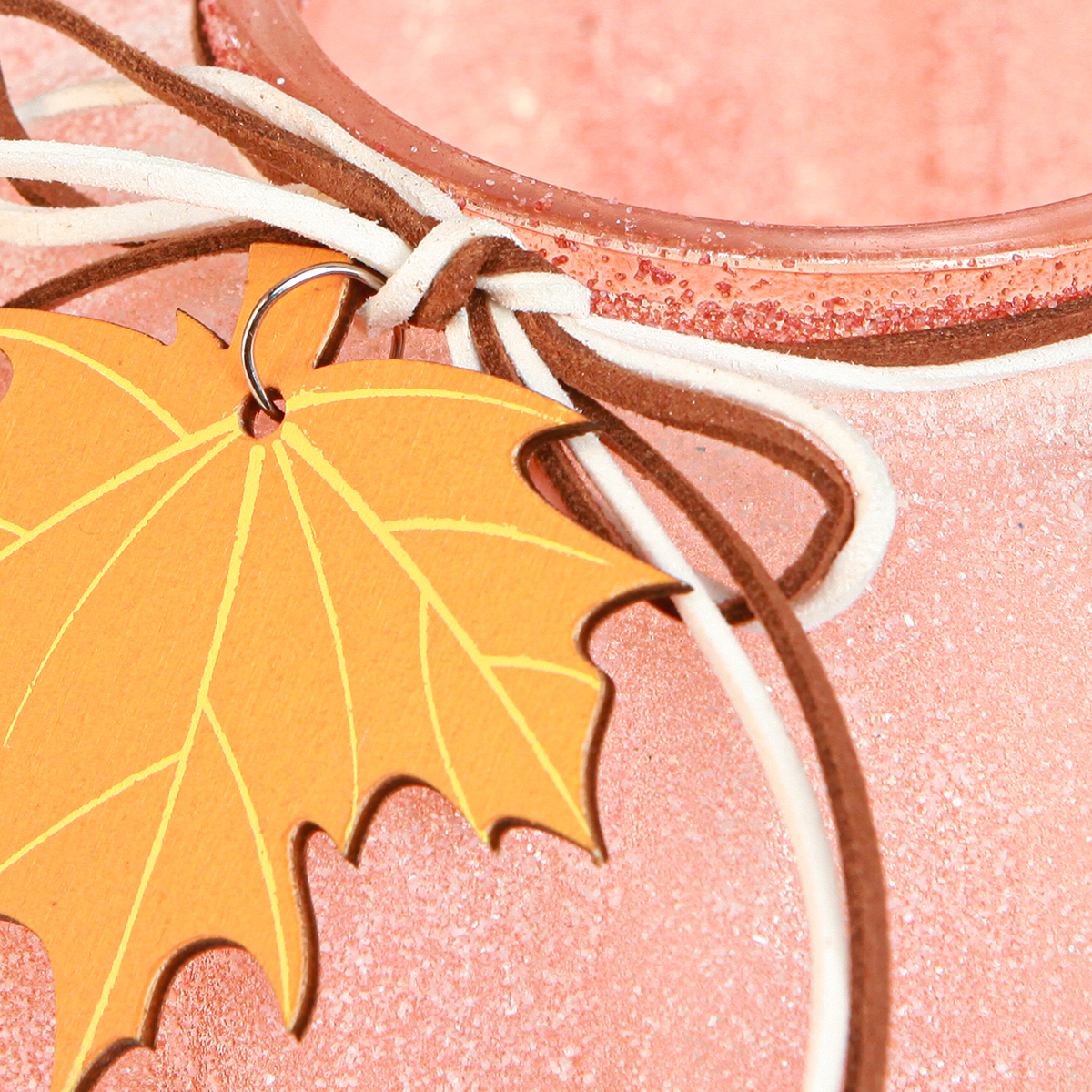 Mit einem Durchmesser von 16 cm und einer Höhe von 11 cm ist das Windlicht ideal für Ihre Tischdekoration, die Fensterbank oder als stimmungsvolle Beleuchtung auf der Terrasse. Besonders auffällig sind die liebevoll gestalteten Details, wie das Blatt aus Holz und die dekorativen Lederbändchen in Weiß und Braun, die dem Windlicht eine warme und einladende Ausstrahlung verleihen.