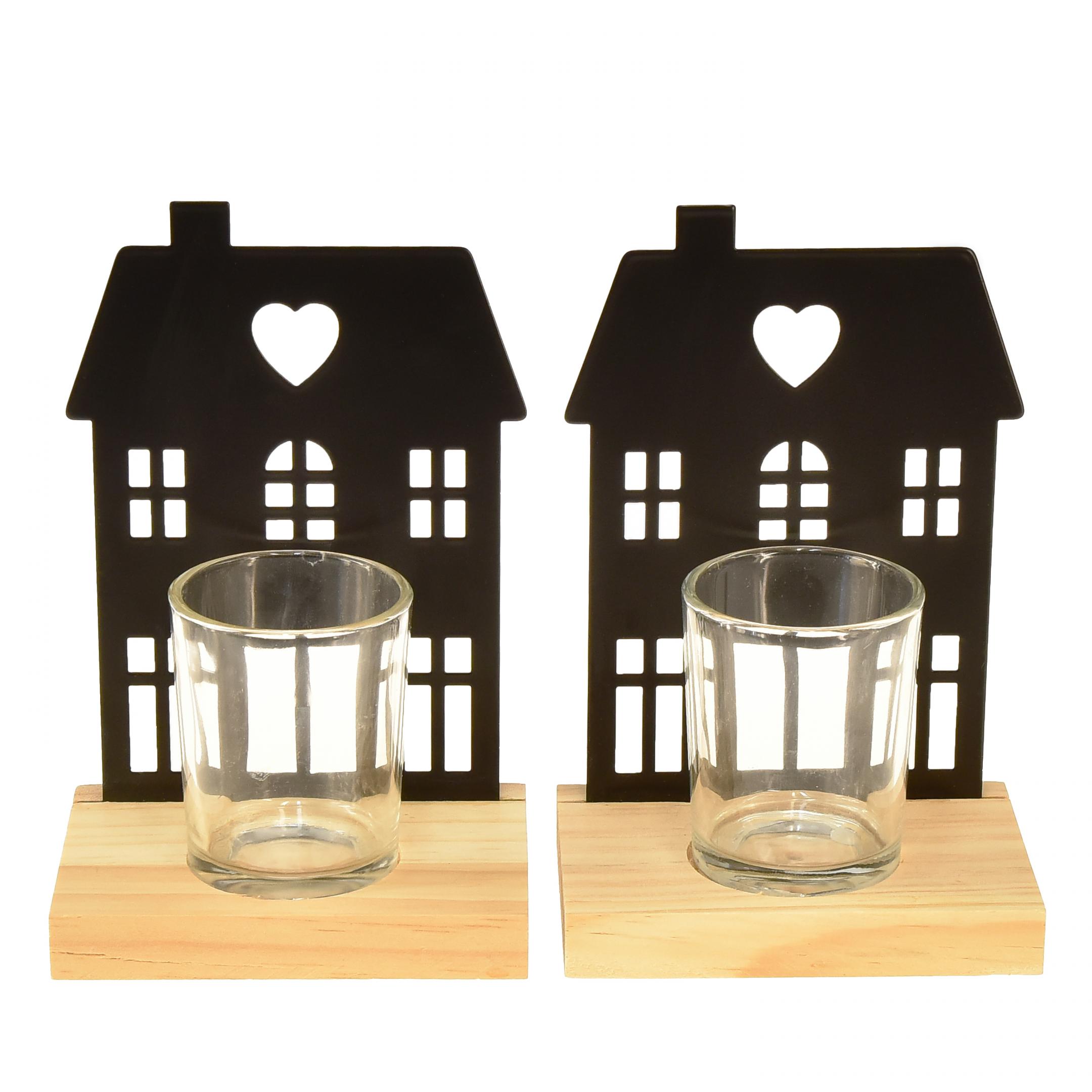 Windlicht Haus Metall Schwarz mit Holz Sockel H15cm 2St