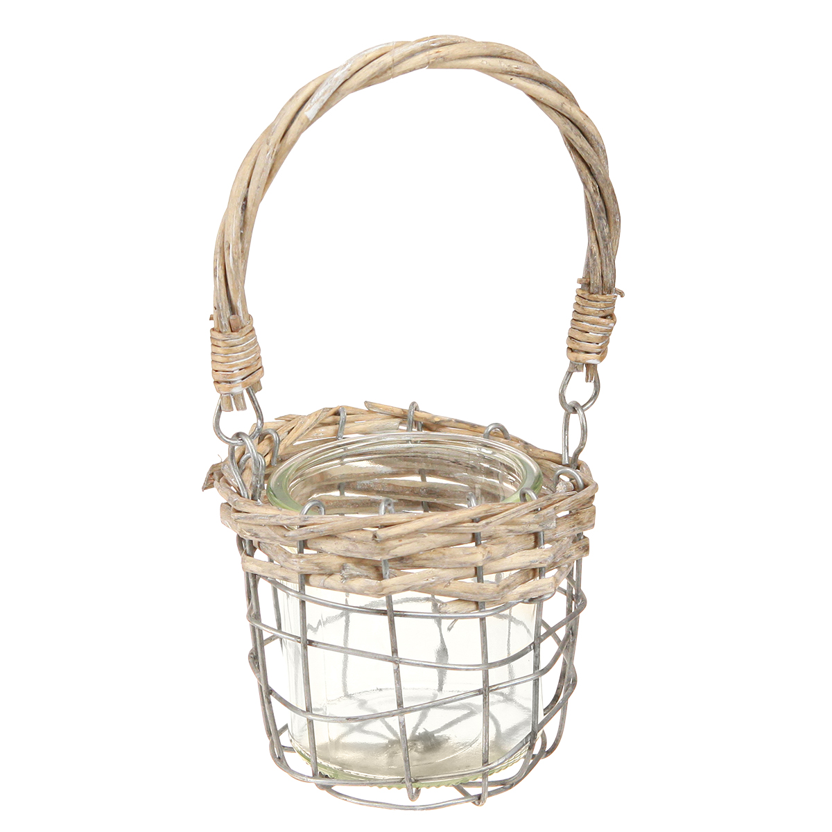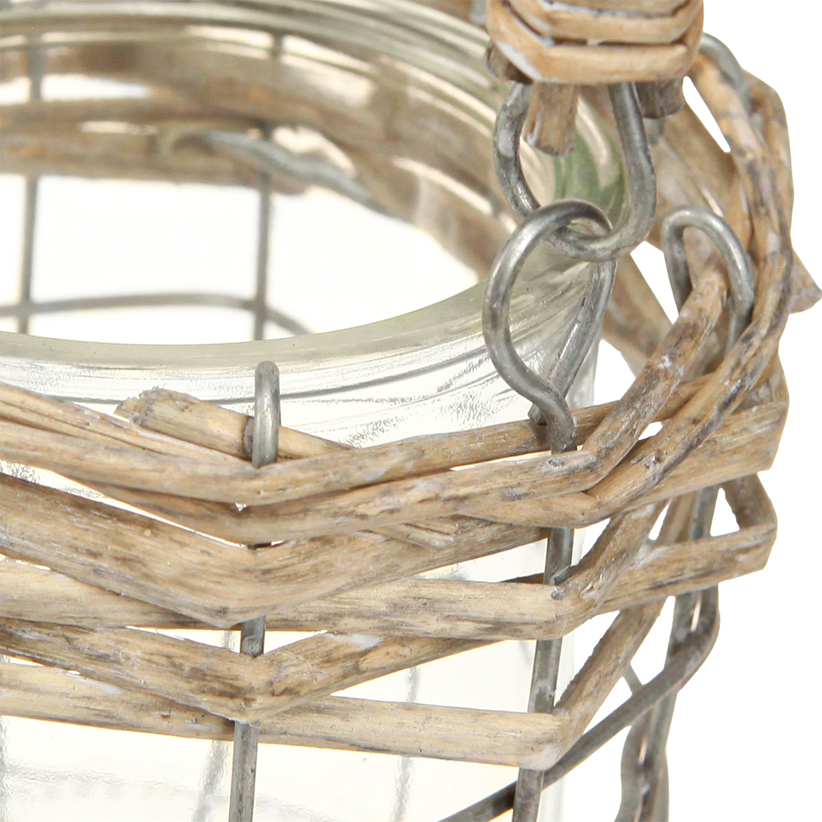 Erleben Sie die harmonische Verbindung von Glas, Metall und Weide mit unseren Teelichthaltern im rustikalen Stil. Das urige Design mit einem Durchmesser von etwa 10,5 cm eignet sich perfekt für verschiedenste Dekorationsideen. Der Teelichthalter besteht aus einem stabilen Metallgitter, das kunstvoll von grau gewaschenen Weidenzweigen umhüllt wird. Der lange, bewegliche Henkel aus Weide ermöglicht es, die Windlichter flexibel zu platzieren – ob als hängende Dekoration auf Ihrem Balkon oder als stilvolles Tischdeko-Element im Innenbereich. Das robuste, herausnehmbare Windlichtglas bietet Platz für Teelichter, schmale, kurze Stumpenkerzen oder LED-Stumpen und sorgt so für eine angenehme Beleuchtung. Verleihen Sie Ihrer Umgebung einen Hauch von Vintage-Charme und schaffen Sie eine einladende Atmosphäre, die sowohl im Frühling als auch im Sommer perfekt zur Geltung kommt.