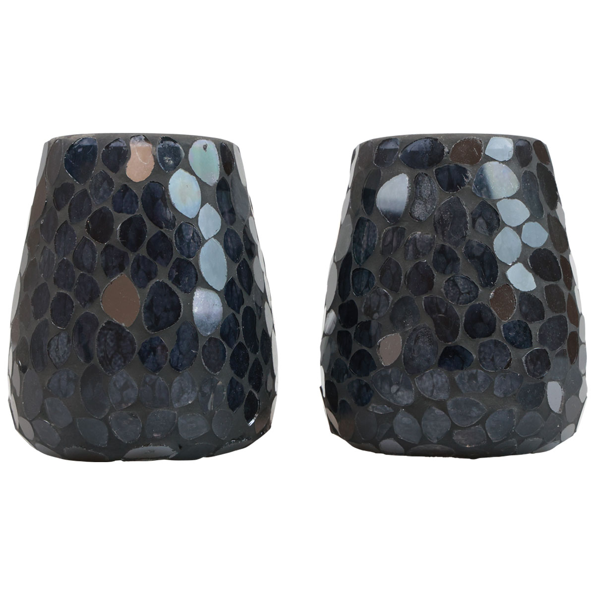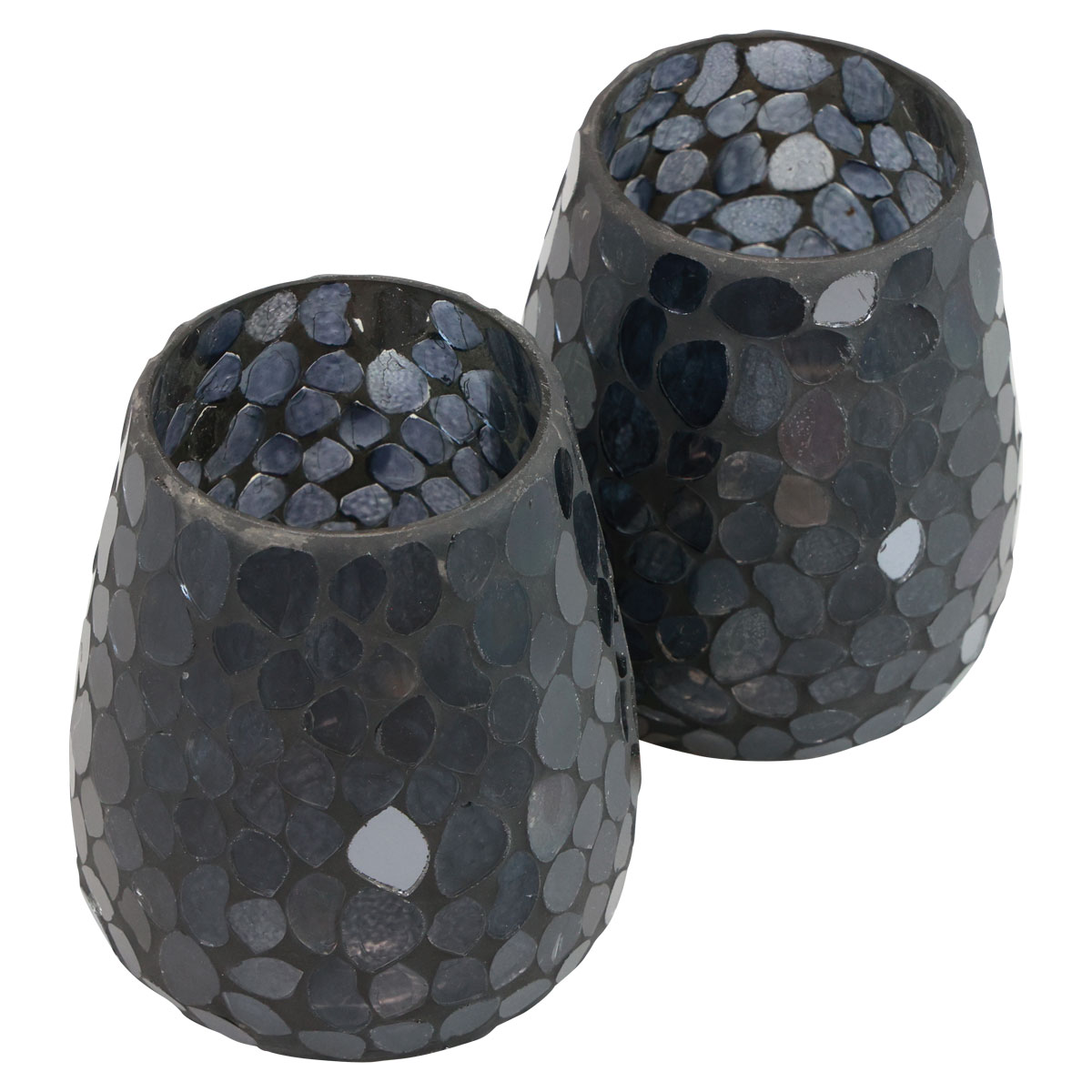 Aus vielen kleinen Glaselementen setzt sich die Außenseite des Windlichtes zusammen. Die Zwischenräume sind blickdicht mit schwarzer Beschichtung versehen. Somit leuchtet das Kerzenlicht des einzusetzenden Teelichts durch die Mosaik-Stücke und lässt den Kerzenhalter in Schwarz in einem mystischen Licht erscheinen.