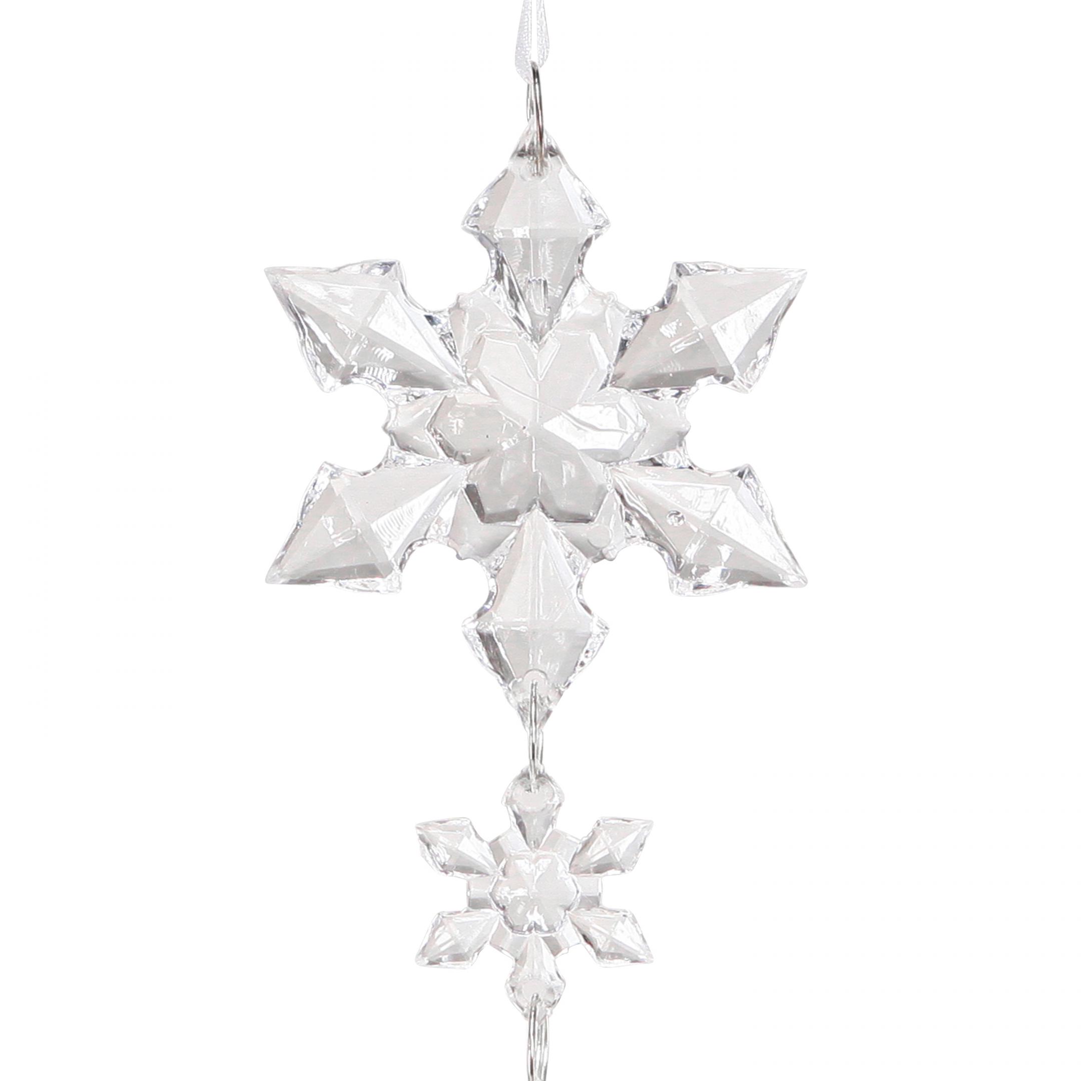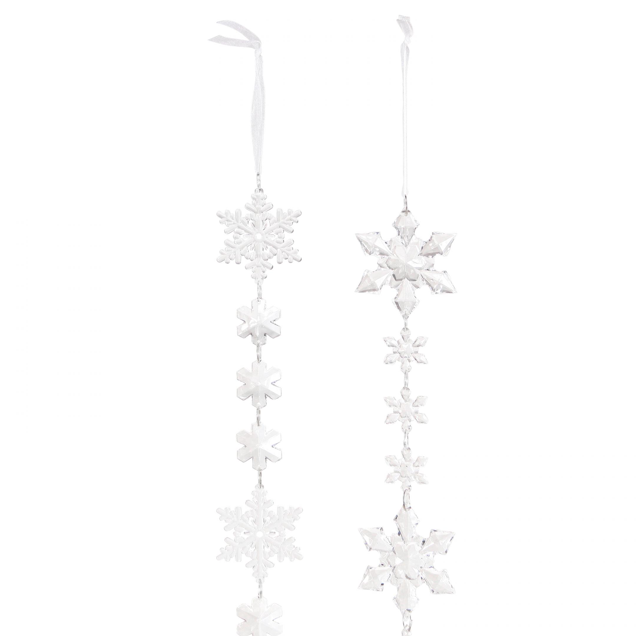 Unsere transparente Wintergirlande mit einer Länge von etwa 150 cm wird zu 2 Stück in unterschiedlichen Varianten geliefert. Die großen und kleinen künstlichen Eiskristalle sind durch kleine silberne Spiralringe miteinander verbunden und sorgen für ein funkelndes Lichtspiel. An den Enden der Girlande befinden sich weiße Organzabänder, die zu Schlaufen geformt sind und somit das Aufhängen erleichtern. Die Wintergirlande ist eine transparente Schneeflocken-Deko, die besonders gut zur modernen oder klassischen Weihnachtsdekoration passt.