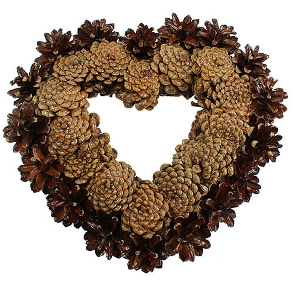 Das flache Zapfenherz besteht aus Kieferzapfen, die auf der Vorderseite lackiert und auf der Rückseite naturbelassen sind und von robustem Draht zusammengehalten werden. Das Herz besitzt einen Gesamtdurchmesser von circa 30 Zentimetern und ist ungefähr 6 Zentimeter hoch.